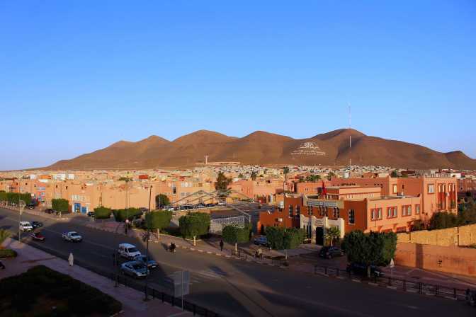 I do not have to wait a long time but I change my strategy: I check on the map the next big town, which is not far away, and I write in my orange border: Guelmin. Another nice family guy stops. He is actually going further but since we still have the same problem with the Moroccan / Islamic culture, I think he decides leave me in Guelmin. Of course he is really kind and pay me a coffee to get me wi-fi, then he also could not let me making camping (why all the men see all the women as the weakest beings in the world?), so he discover that the Coffee Shop where we are is also a Hotel and the cheapest one around. He offer to pay the 100 Dihrans by himself but I say I would just accept half of it. Deal. The place is pretty nice for the price and with a good wi-fi (which stopped working after a while but luckily I had done the essential things first) so I could have a good night of sleep. I even have a pretty view.