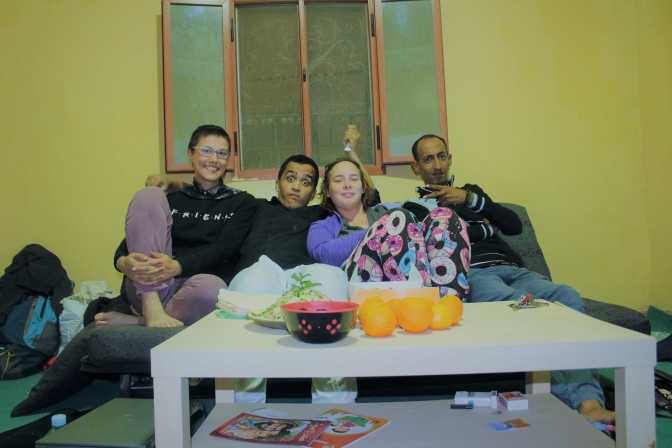 My first Sunday it is pretty busy but really great! In the morning, me and Liz go to look for some presents. She want sweaters for Med and Moulay. It takes us a long time to find them and a lot of her money (in my opinion). In the end, even I got a present! She bought me a beautiful rainbow color dress. It is really nice of her. Back at home, after wrapping the presents, we eat some Mac and Cheese and go to her friend’s house, Shawna. We take two taxis to get in there.