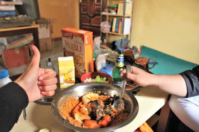About the food, there are a few things: at lunch, I eat with Moulay at the library, most of the days, the traditional rice with fish (Thieboudienne or Ceebu Jen) or with chicken (Marou Diouk) plus some vegetables. Once, I have lunch with Liz at a Syrian restaurant, and we have a really good tortilla sandwich, with vegetables, mushroom and cheese. At night, we usually have the cuz-cuz with chicken or fish plus vegetables and French fries. But we also ate a delicious Falafel once or some pizza. I taste the Camel milk (a little different weird taste); the Bissap (a purple juice made from Yibiscus flower) which is made as infusion but should be drunk really cold; at the beach, I tasted the Touba Coffee (black coffee with a lot of spices and honey); on the corners there are always a lot of women frying and selling our Bolinho de chuva (Little cake of Rain) from Brazil but here they called them Benna; and for last, the date fruits (I think they taste like healthy chocolate).