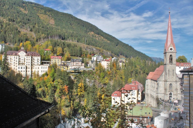 Bad Gastein it looks very nice at first sight. Old buildings, pretty cool ones, and this huge one just in the middle of the town, a hotel called Europe, If you did not searched so much about the town and what to do on it, like me, you can get very surprise to find out that there is a waterfall crossing the middle of the town. Probably one of the big reasons which attract so many tourists to here. But I do not know if it is because everything is closed (since it is Sunday), but it could not be since I am not into shopping or cafes anyway; or if it is because of the hundreds of hotels everywhere. Which makes the town looks like a ghost town (seriously, there are like three columns with about ten names of hotels and their directions everywhere in town); I do not know but I have the felling that something is missing, that it is a fake town. It has some beautiful views and a beautiful church, plus the waterfall, of course, but still. And you have loads of options for hiking and go to explore further points around town. Maybe that increases the good experience. And of course you do not need to worry about finding a hotel to stay over night. Nope.