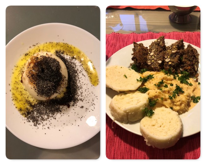The food is amazing thanks to F.. He cooks excellent and diverse meals. We cook ourselves too. I succeed sometimes (like in the Vegetarian Cannelloni and Chickpeas and Spinach rice) and not so much in others. Now that Daphne left (over a month ago actually, when together with her father and her Embassy, she managed to catch a flight back to U.S.A.), I am the responsible for making cakes time to time. F. also prepares the Brittish Crumble time to time. It was the first time I tried and of course I loved. We also had this traditional Czech dessert, which consist in dumplings full filled with plum jam and poppy seeds on top. Actually we had quite a few traditional Czech dishes as well, including the goulash with the dumplings, the lentils soup, the Czech Ginocchi version, called Halusky, and many Czech soups.