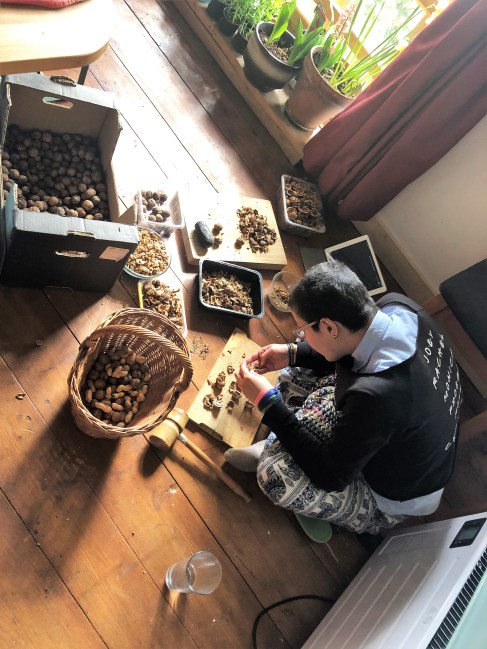 Thanks to Daph I learnt how to prepare walnut butter. They have two walnuts trees here and plenty of walnuts to be broken free of the shells. So since I am the only one in love with the walnut butter now that Daph left, what I do is, every Saturday morning, I break enough walnuts to prepare my week set of walnut butter and an extra portion for F. and P. to do what ever they like.