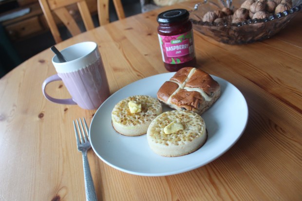 I am not sure anymore of difference of food prices between here and Brazil. I sure damn remember it was not cheap to buy fruits and vegetables back in there before I leave. Right now I believe the prices are almost the same, with the difference that people get much better paid here than there. I get some vegetables, fruits, milk, yogurt, oats for porridge, toilet paper, peanut butter (an outrage, I know, but it is for protein), eggs, bread, jam, butter, some local delicatessen (which F. said I should try) like crumpets and hot cross buns (the first ones I loved but hot cross buns are yucky to me), oil and sugar, all for about 24£. Not so bad in my opinion. It is food for two weeks so…