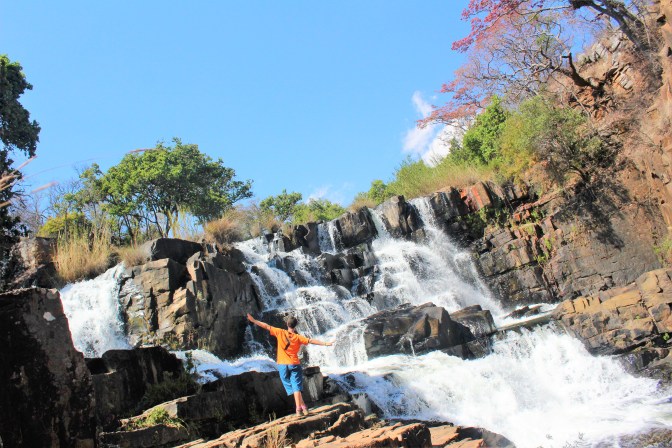 I do not know how far it is but under the sun, without water and with the bags, it feels so far. Once in there, I talk with a lady at the reception. After I explain everything to her, she wants to help me but she is also afraid. I do not know if the manager or someone responsible for the place is not around or what, but she decide to let me go visit the waterfall. And she ask to a very old guide to come with me. He is funny. We walk on the road for about 20 minutes. At the parking we start to go down in a trail and then in five minutes we reach the waterfall. I am surprise in how beautiful it is! With all do respect, so much nicer than Moremi. A big amount of water coming down and down again, ending in a small river. Beautiful! And this time I manage to take a nice picture.