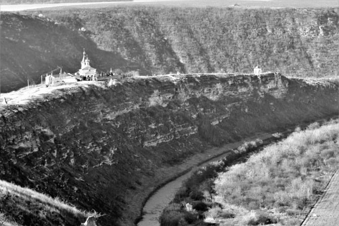 I get water from a bathroom beside the hotel which is closed. I leave my backpack with two ladies at the entrance and go to visit the monastery. The view is wonderful and the sun is nice. The church is quite cute and small. Very beautiful too. I walk a little bit ahead and on the way a Spanish guy with a Argentinian girl ask me if I know about the monastery being open now. It happens that under the church, there are the remains of the old monastery, caves in the rocks. I had no idea! I knew Tipova Monastery is like that but I did not know about this one. But when I come back to check, it is still closed anyway. What a shame!