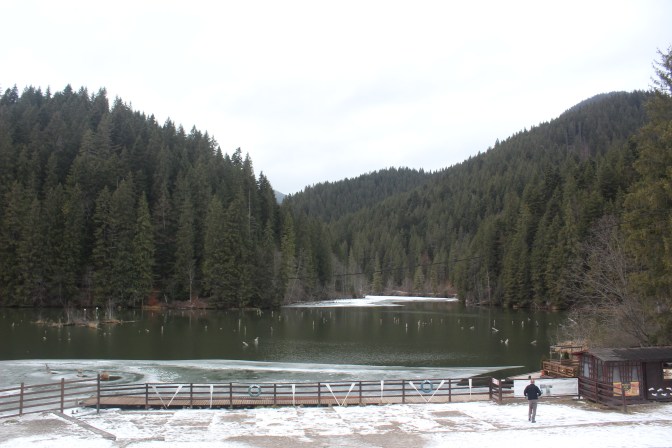 It is a beautiful drive, when we stop in the Rosu Lake, I don’t realize that would be out of route. I am only not impressed, even more, surprised, by the fact that this lake is so well recommended to be visited in Romania. Actually, the mountains we pass by, just after the lake, they are gorgeous! Unfortunately, I am not prepared for them and we pass really fast so I couldn’t take a photograph. The place is called Cheile Bicazului.