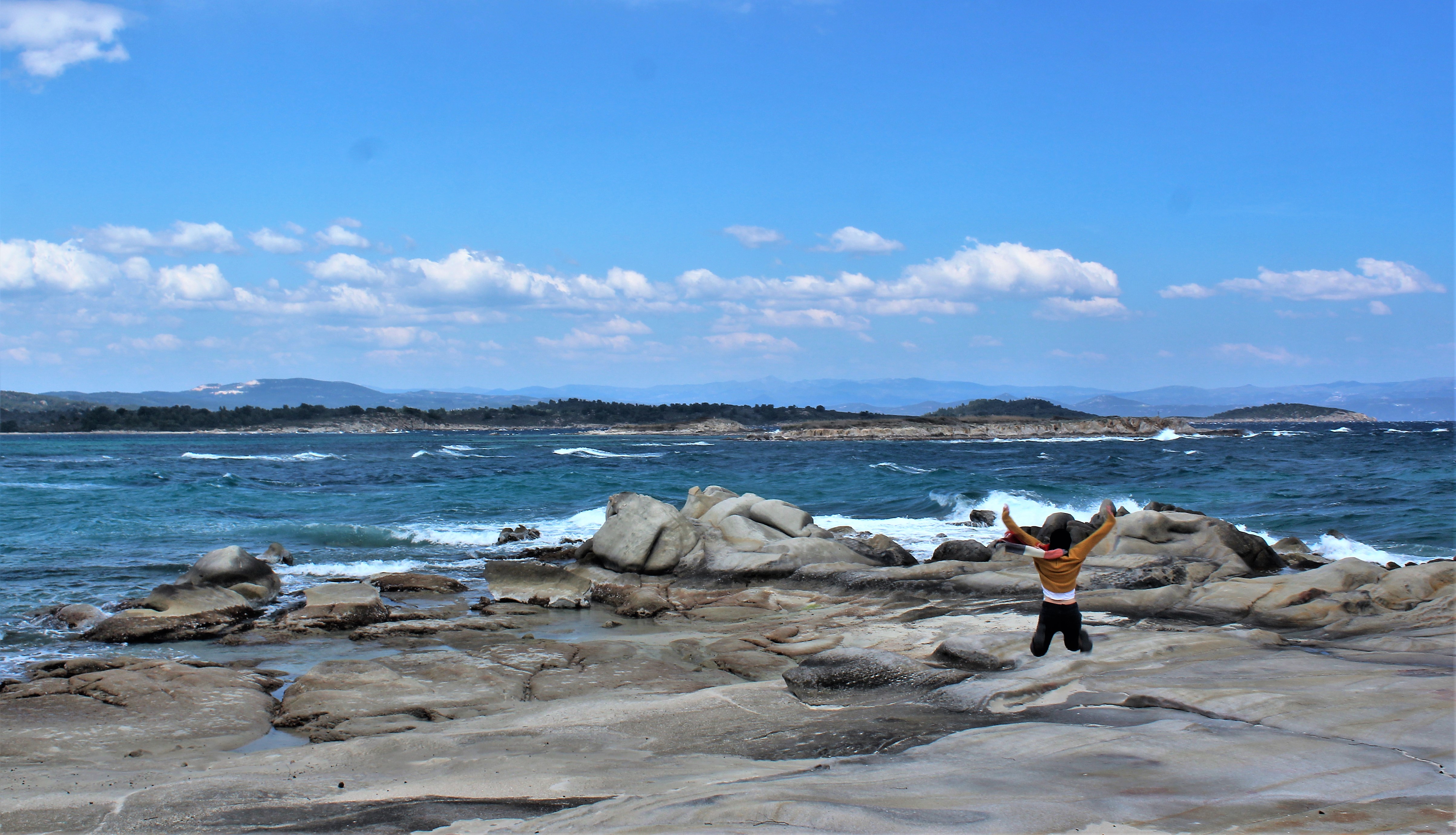 It is quite windy and when I get in there, Oh, Loki! I am almost carried by the wind. Insane! The place is amazing, for sure, but definitely more enjoyable if you can stand still. This beach is called Karydi and it has beautiful rocks, flat areas where you can walk and take some nice shots, and the sand is quite white. Water colors are amazing, between some dark turquoise and dark blue.