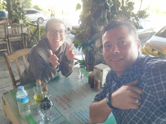 Mutlu drop me off in a town called Nice. Suleyman and his Blablacar passenger, Veidat, stop in a few minutes. Poor Suleyman, at first I was a bit uncertain about him, perhaps because he looks like a military man (who he is, a helicopter engineer for the army), very strong and serious. Well, after a few minutes you can see how nice and sweet he is. He took me for a been snack (which he called “been party” later) and after we stop for a great view of a beach called Akyaka, where we also have some tea. We talk about our travels, he has also been to many countries in Africa with the army. He is going to his hometown, Doloman, where he drops me off in the highway.