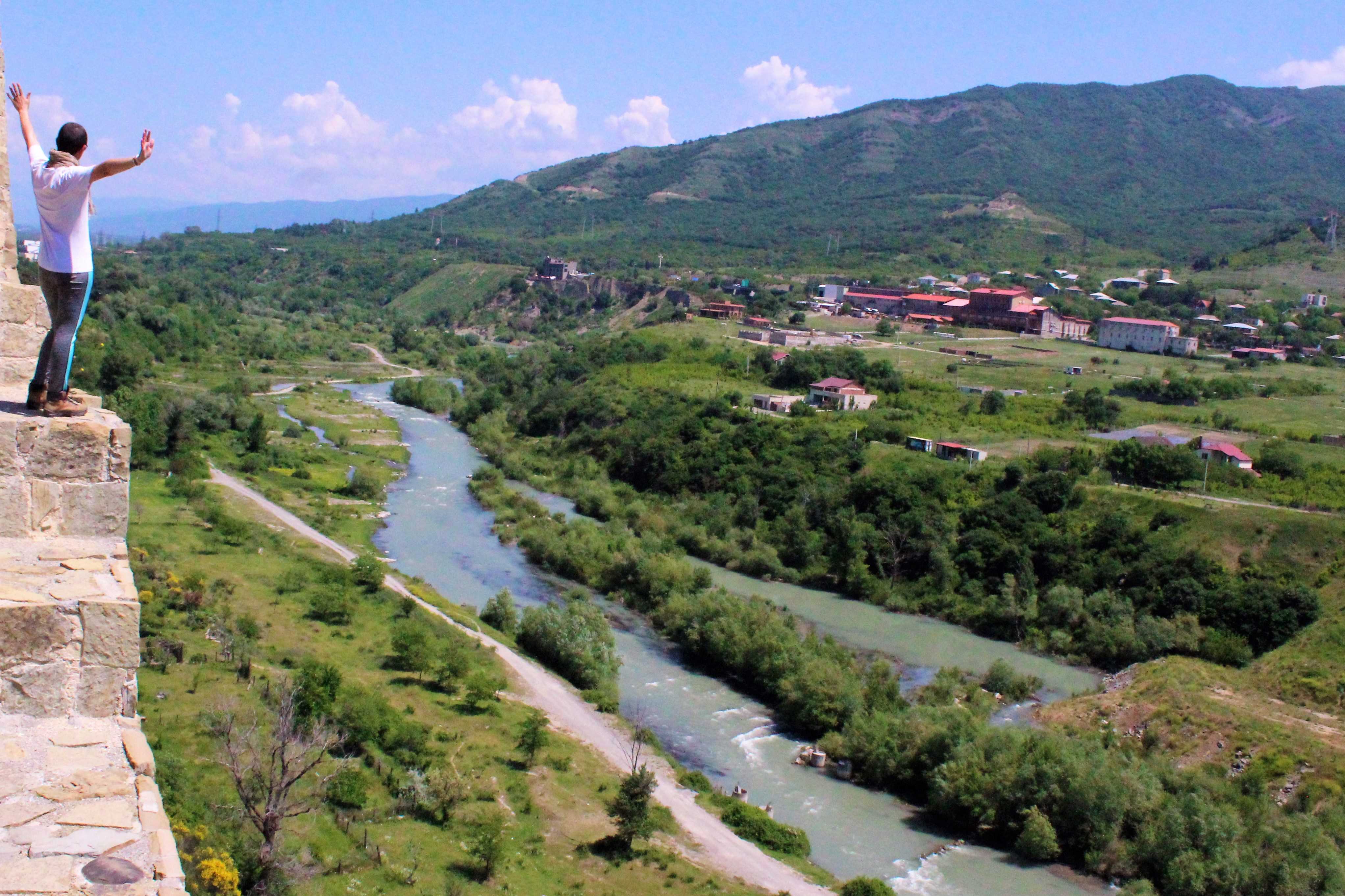 From there I walk to Bebristsikhe Fortress. I will pas by here on my way to a camping place, but if I come all the way now, I can have more freedom to explore around without my backpack. I am shocked by the lack of care and respect to this place. The fortress is completely abandoned! It is such a shame! Going down, to what it seem to have been a park one day, another careless spot. Some old ruins, looking like an old amphitheater, also completely unattended, some old buildings abandoned to rotten. This whole area is surrounded by the Aragvi river, and it could be a massive tourist attraction if they were to create a proper and attractive path alongside the river and take care of the park.