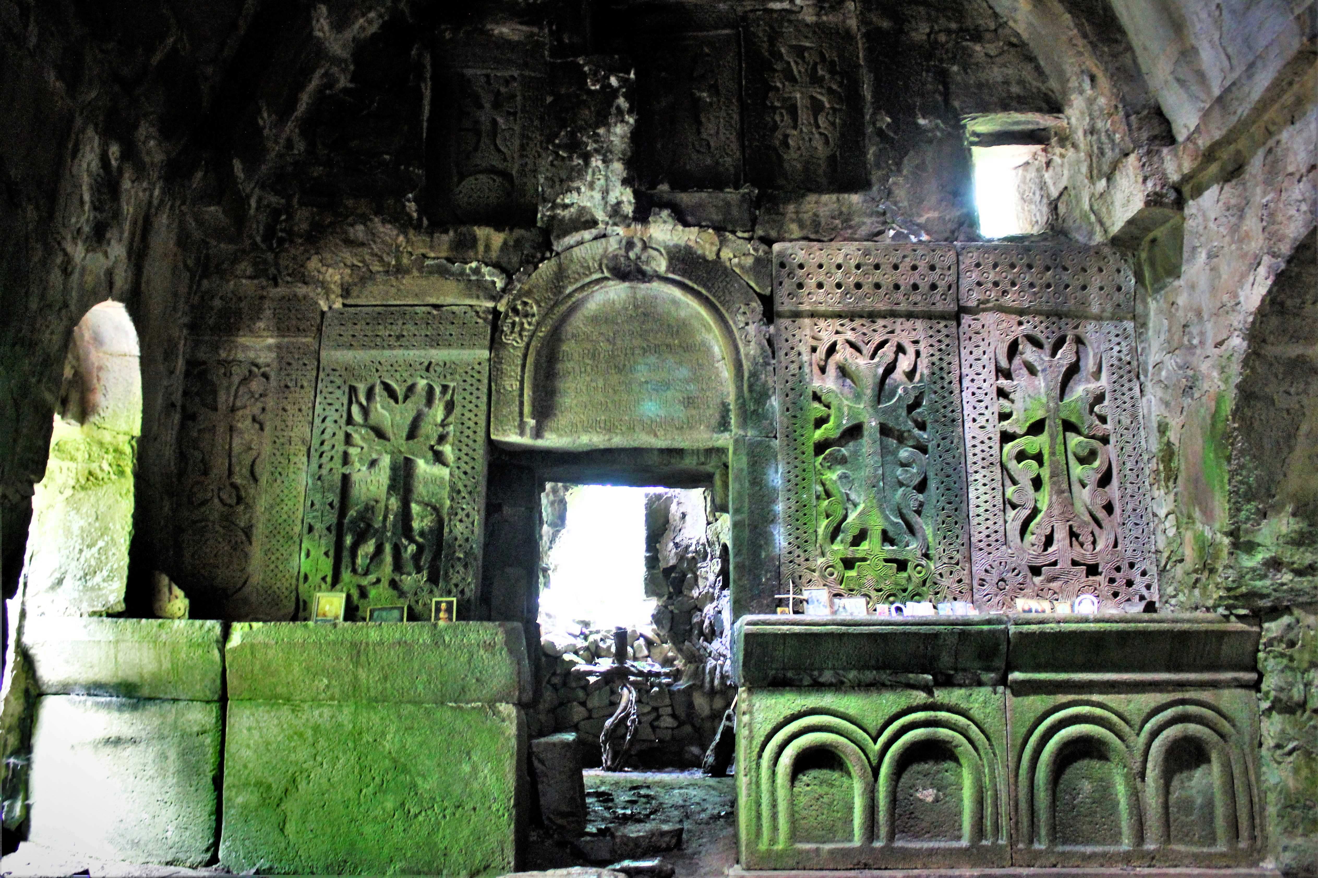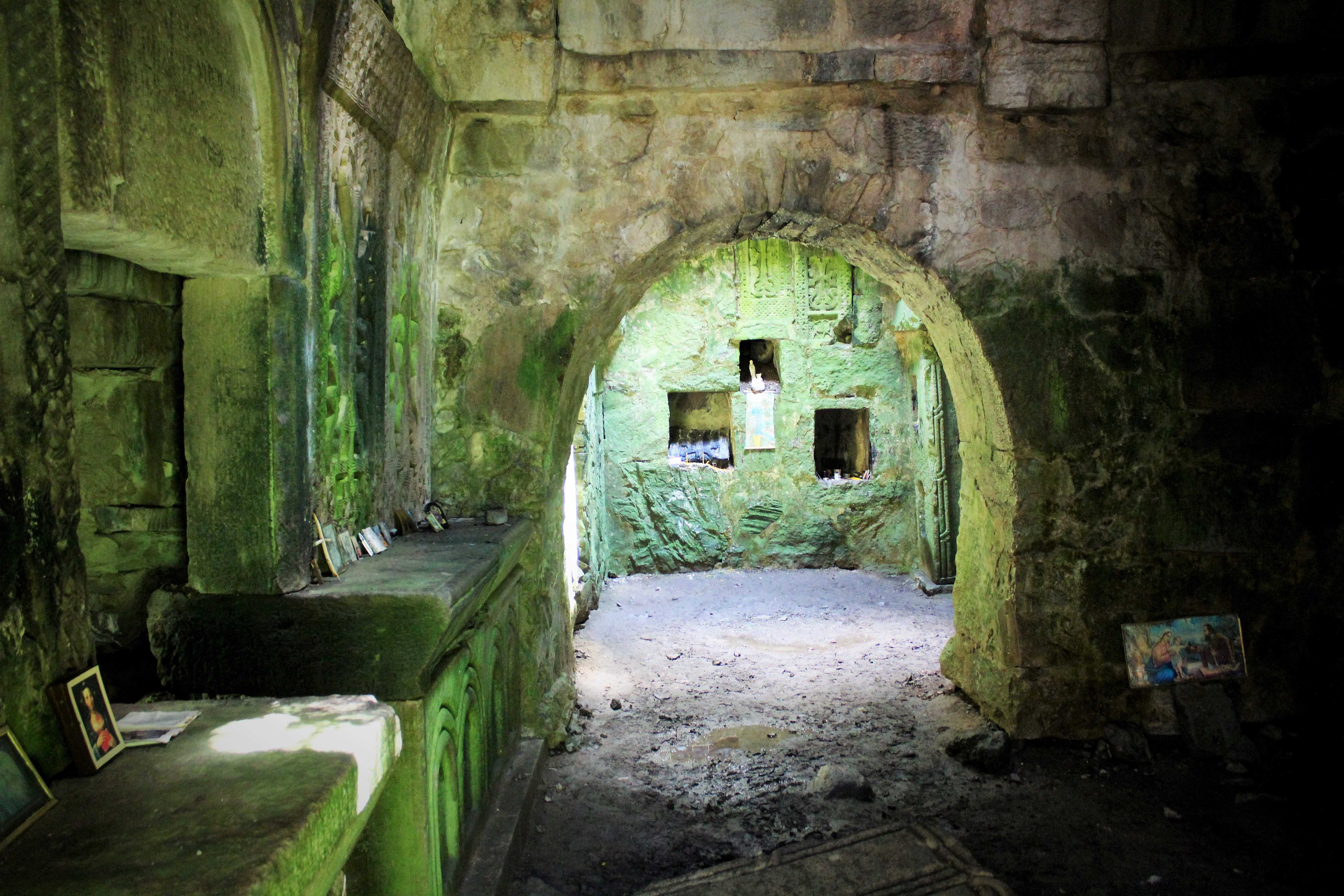 Motsavank it is a pearl! The true beauty lies inside. For some reason I don’t know (which could be the fact that the outside is almost entirely covered by plants now), it got all covered in lichens, so it is almost entirely green, and the way the light strikes the place it looks magical! A bit creepy, but cool! The shapes of the rooms, its doors and frames, the cross rocks, everything it seems coming out of a horror film. Or The Lord of the Rings. In a small version though.