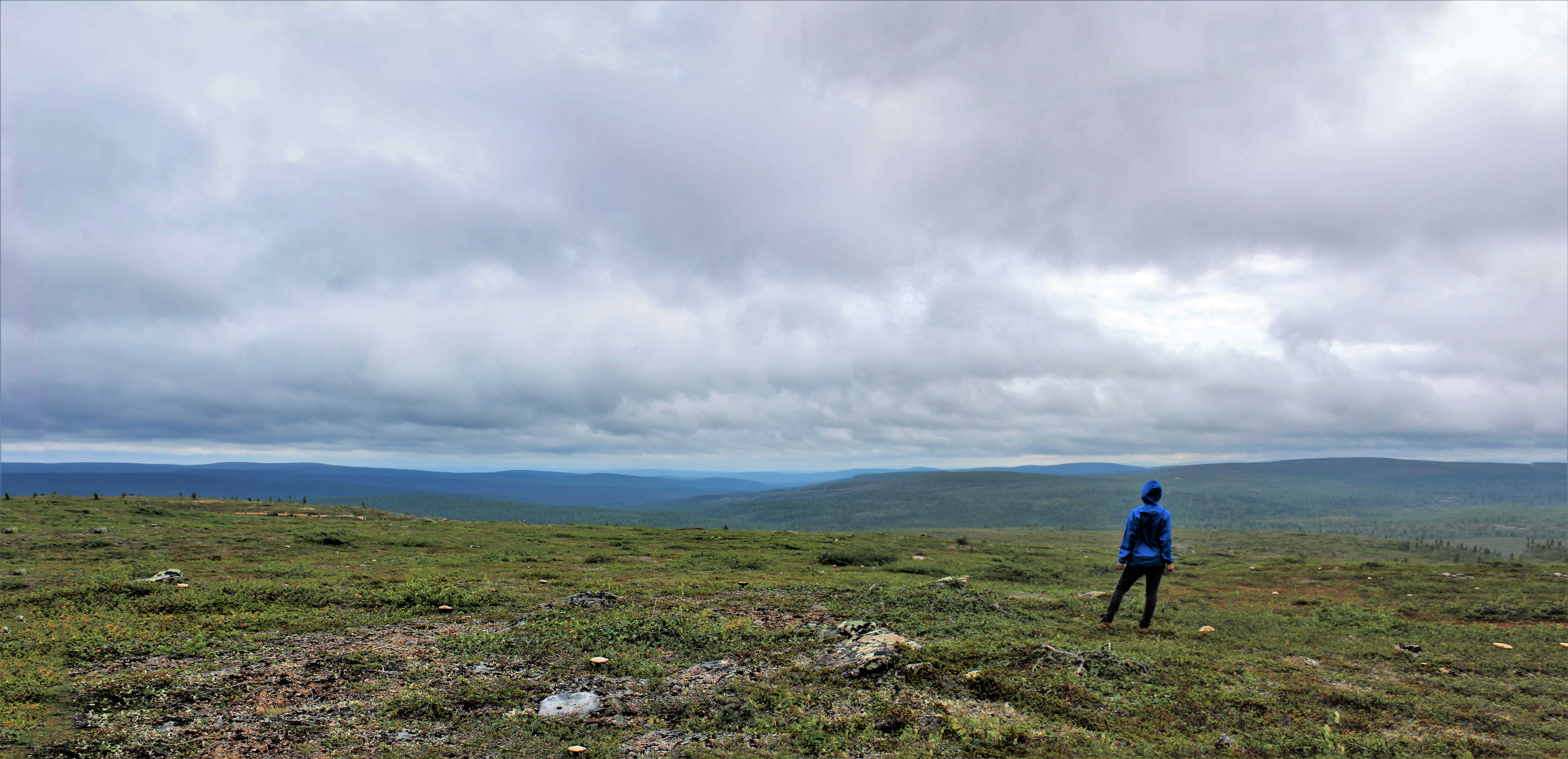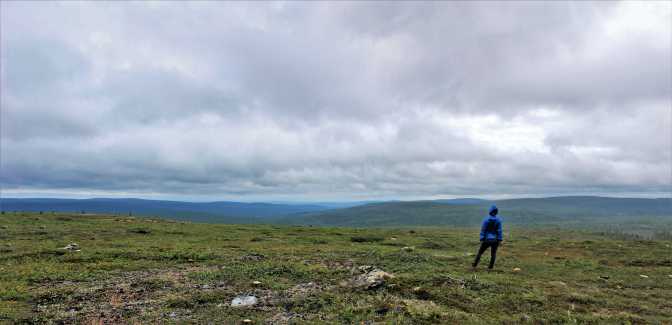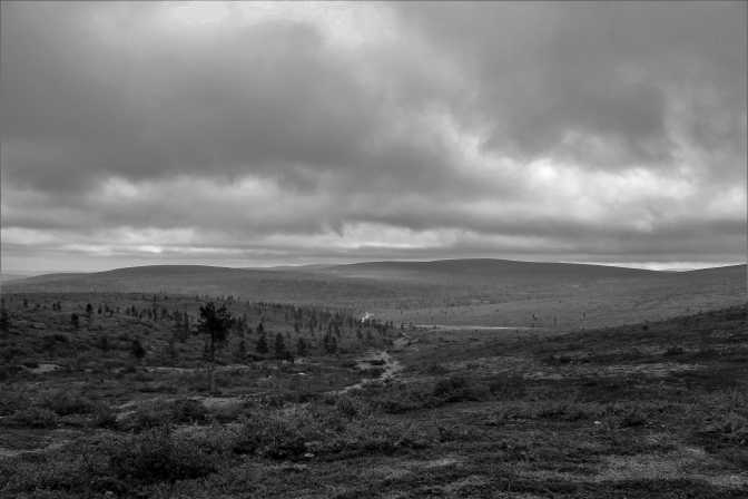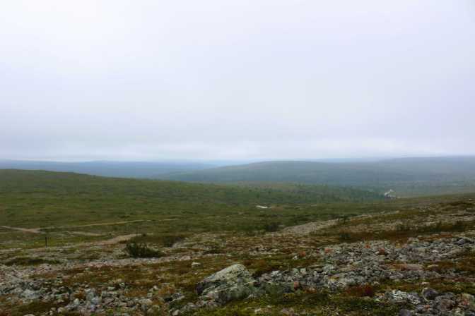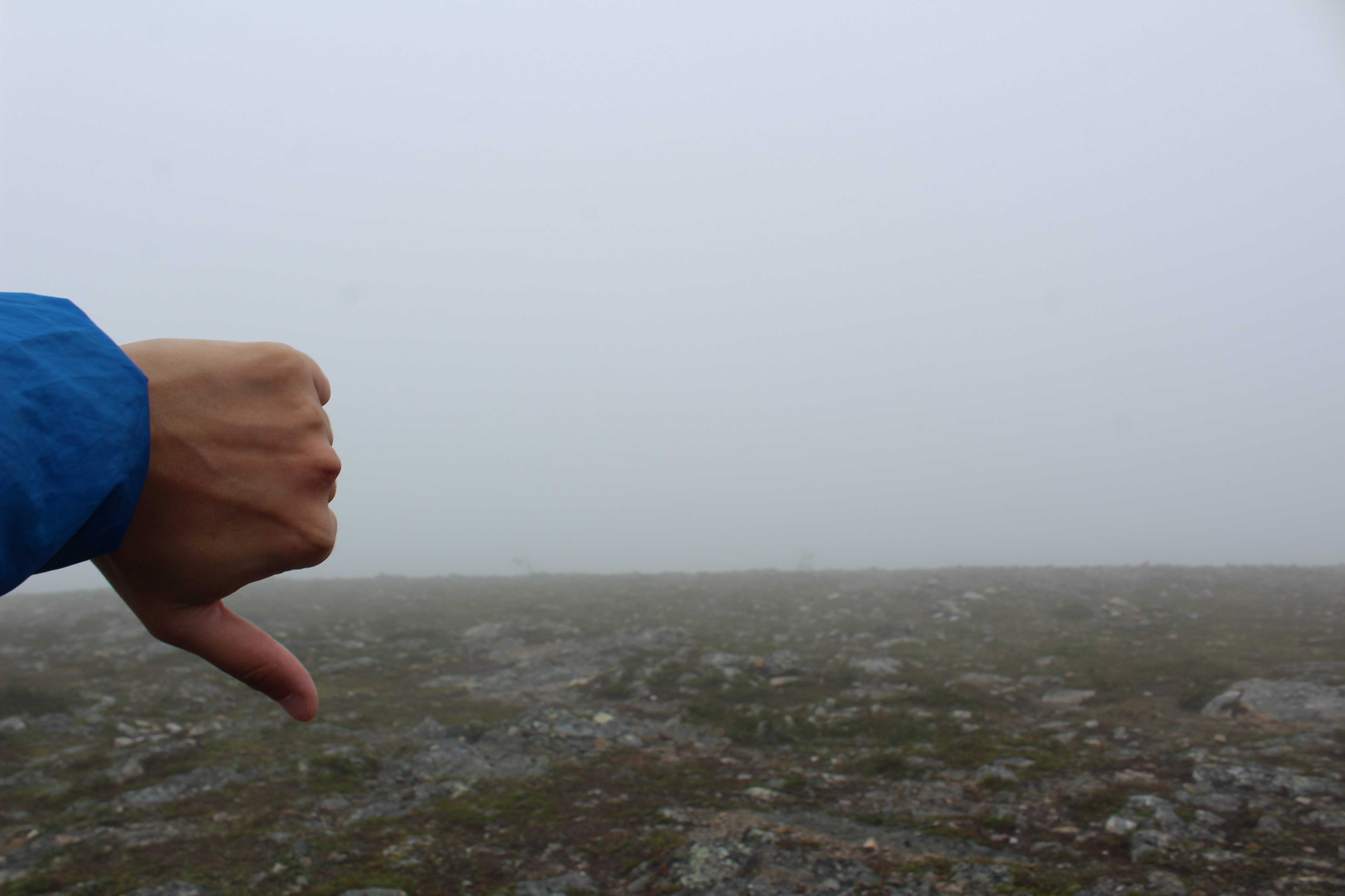 The weather is really bad! Super foggy and grey, a bit cold too. The trail to the top of Kiilopää Hill is less than 2 Km, but this weather makes it difficult to breath. And I can’t see shit! What is the purpose of going up a hill for the view when you cannot see shit? Once in the top, and no visibility what so ever, I decide to go down and take another route back to the beginning.