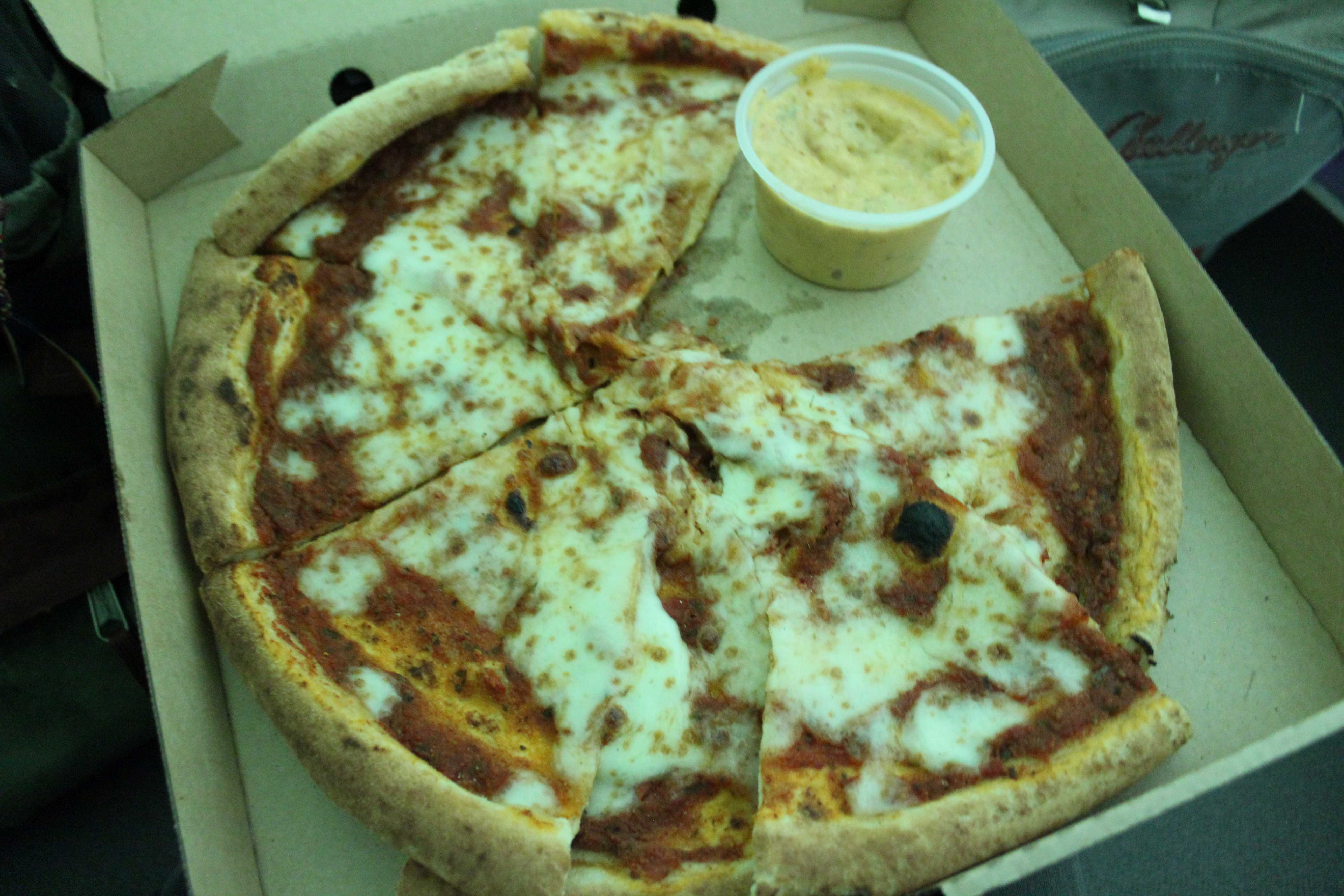The young lady asks me if I want to eat in or take out. I tell her that so they have more seats for they paying customers, I rather to take out. In a few minutes I have a delicious and steamy Margarita pizza with me. I say many thank you to everyone I can spot in the restaurant.