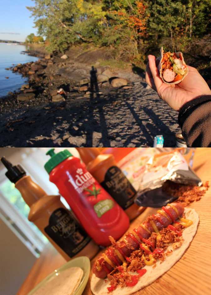lømpe hot-dog (a flat bread made of potatoes, which you have with grilled sausages, fried onions and sauces)