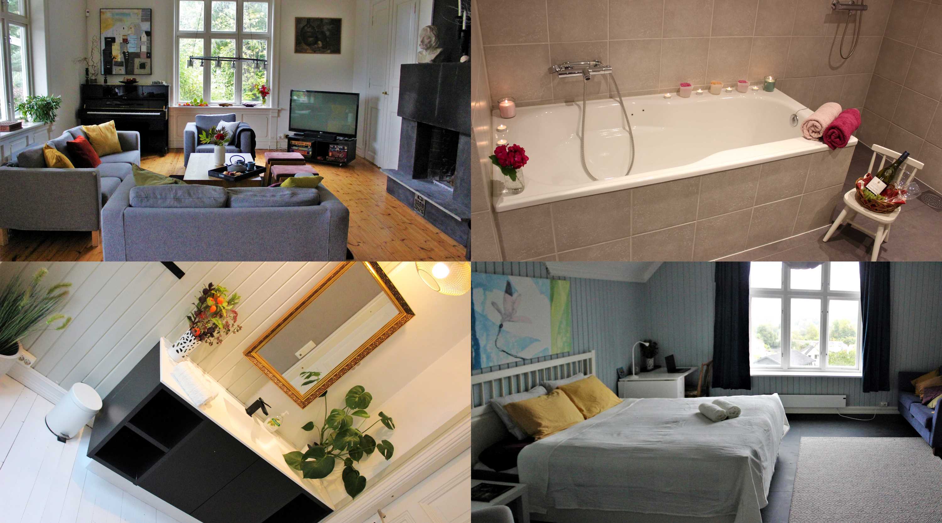 Living room; my art work with the bathtub; our lovely bathroom upstairs; my room 😍