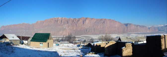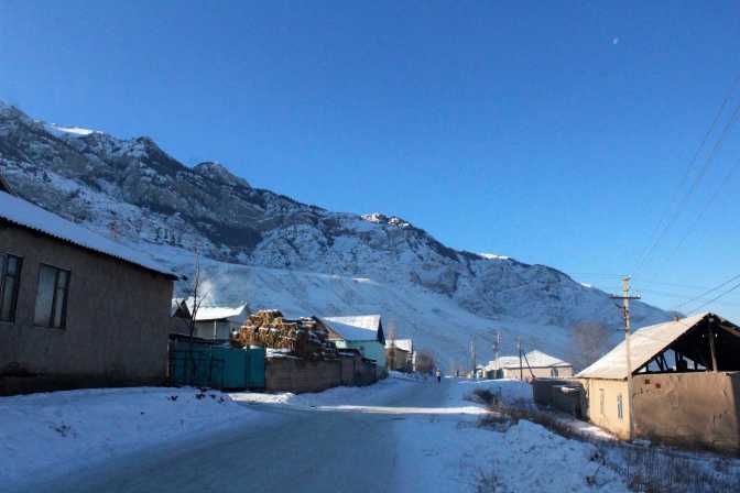 When I step outside this humble but warm-hearted home, the moon is still shinning in the sky (photo), and I realize that we are right under the hills and the views are great from here. Although it feels a bit scary to live under hills covered in snow. I walk further more outside Naryn, so I can hitchhike to Arslanbab. If I only knew what was to come…