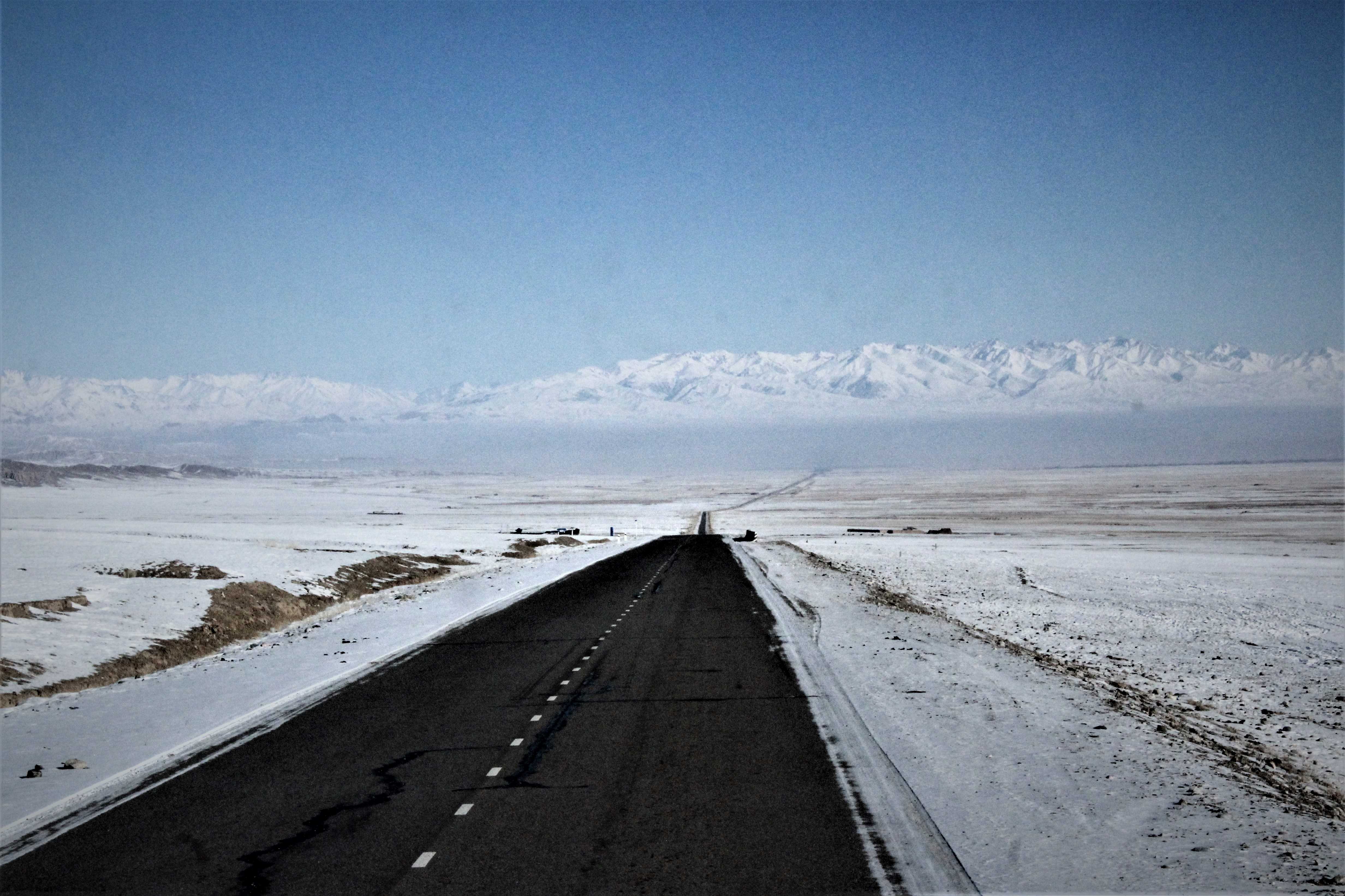Early morning there are no cars taking the road to Tash Rabat.