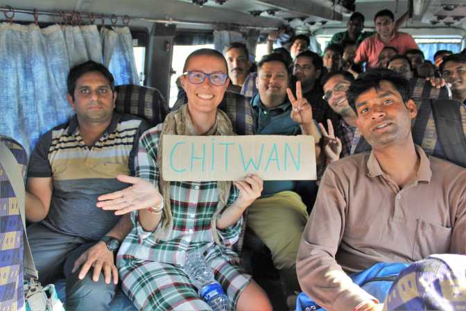 A travel bus, a regular travel bus with many people on it, is checked by the officers and is going to Chitwan. The police officers tell me I can take this one. I am about to enter, when another smaller bus also stops. This second bus is a private one, and big group of friends has rented to go to Kathmandu and visit a temple. For that reason, it will arrive faster in Chitwan, because they will make no stops. That’s why the officers change their minds and tell me to take this bus instead. When I enter the bus, a surprise: about 20 Indian men are inside. I don’t know who is more surprised, them or me.