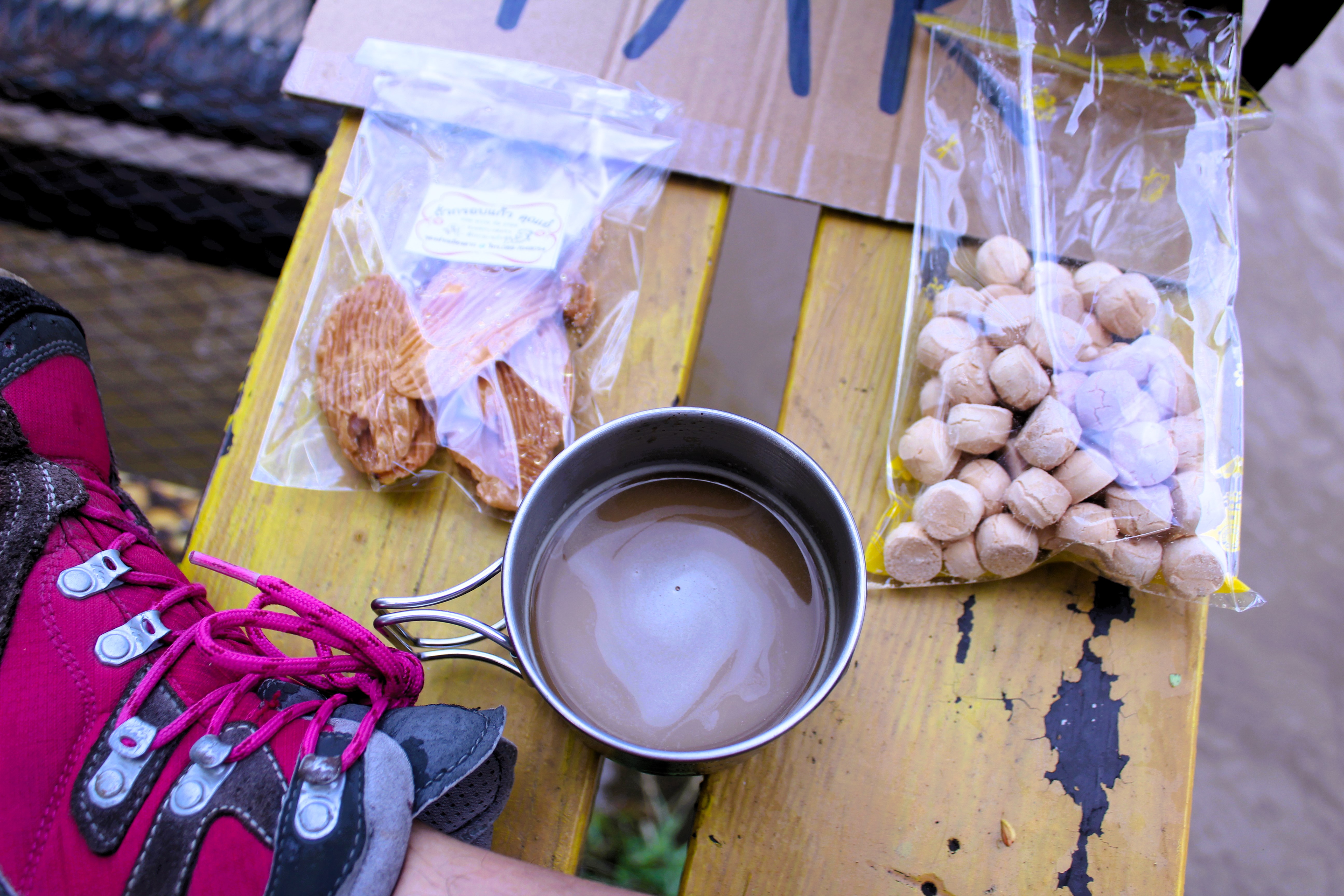 Now, this place is really nice! It is called Pa Mali Rim Ping Thai Noodle, located just by the river, so you can either eat in or grab your food take away and sit by the river, where there are some benches on a small floating pier. It is also abandoned, and a bit destroyed, but it still gives a nice view of the river, and it has a lovely shade from a tree to protect you from the strong sun. The rice soup is delicious! I also grabbed some of the local snacks, and after asking for some hot water, I go to the river to make my coffee and have it with some Thai cornstarch cookies.