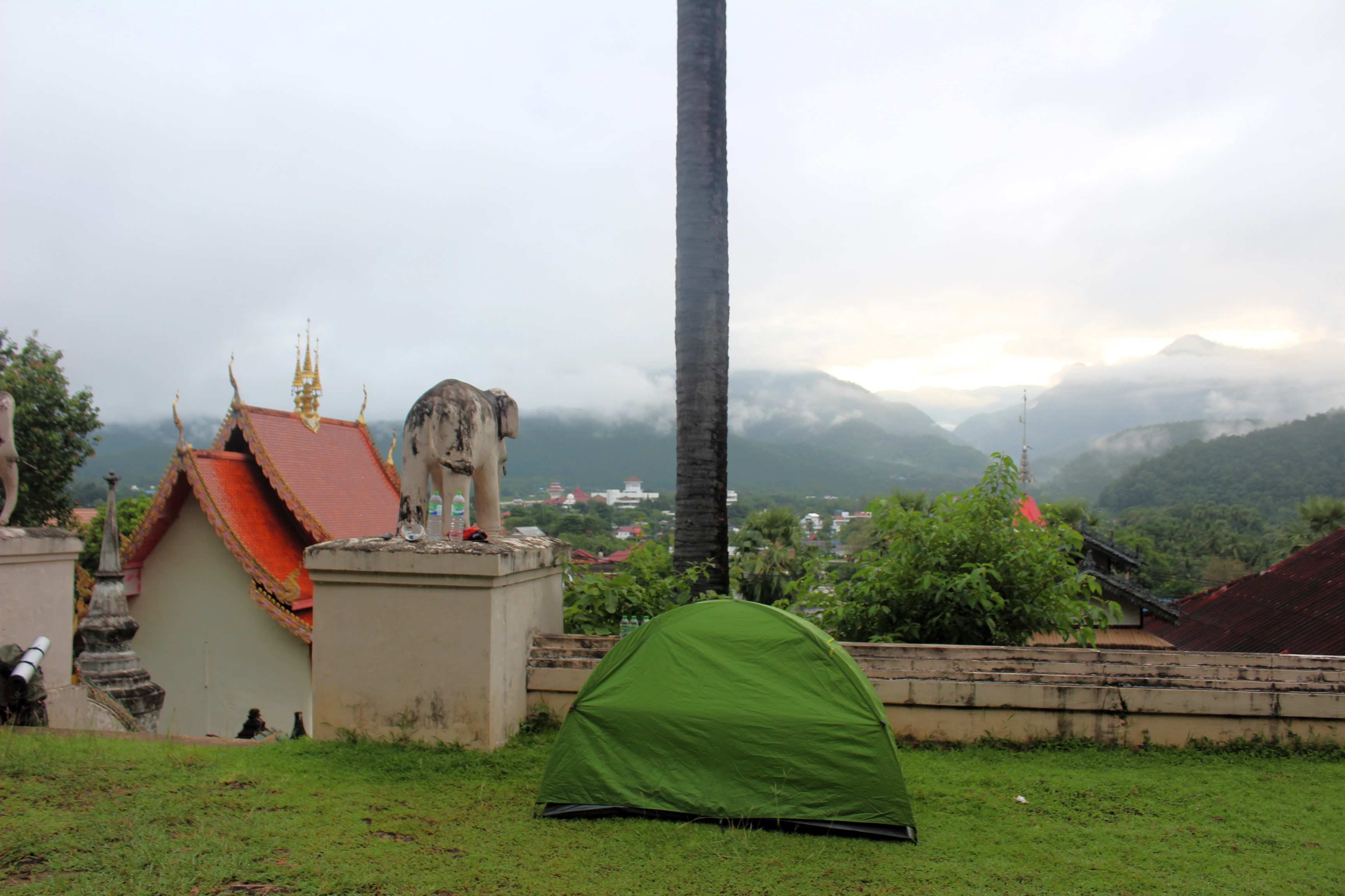 I walk to the monastery right next to them, Wat Muai To, and after talking with a few different monks, one of them show me to a small temple up the hill, a place with a lovely view of the mountains, a bit away from the monastery, which seems just perfect. Unfortunately, 5 minutes after I start making my camp, out of nowhere, starts to rain. I couldn’t properly finish pitching my tent, and because the rain is heavy and lasts for quite a while, I am worried if it will get wet inside.