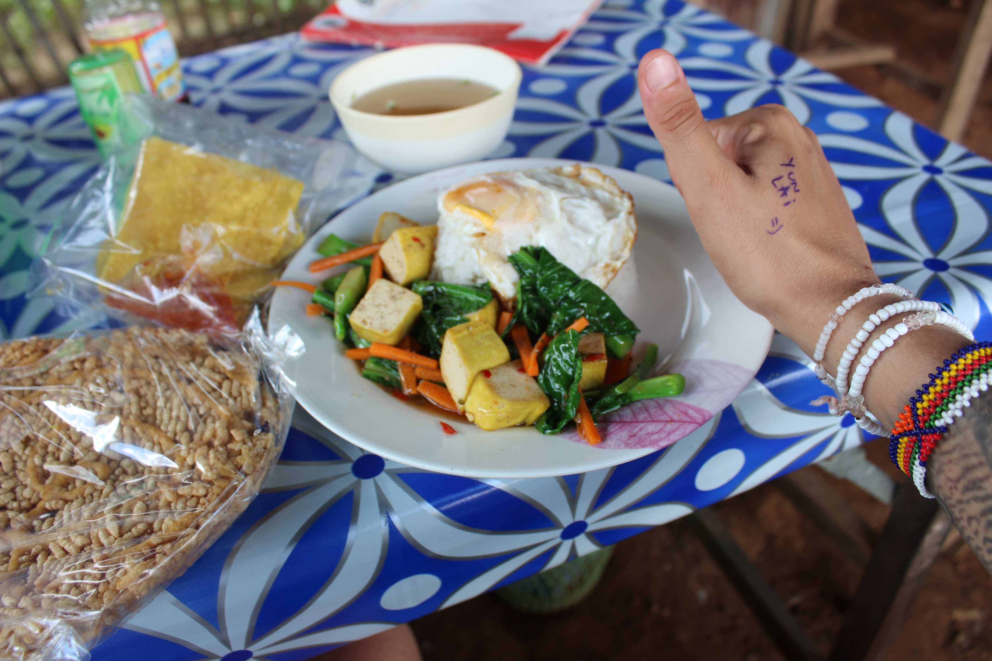 The first food stall I try to eat, the lady doesn’t seem bother too much to help me to find out something to eat which is vegetarian. So I decide to find another place. I walk back about 100 metres, to this very small place, in front of an also small grocery shop. Sunny, a very friendly and smiley young girl is the owner. She can speak a little bit of English, and even asks me if I can eat spicy. I ask her if she has tauhu (tofu), and she says yes! Yay! So I ask her to prepare some vegetables with tofu, some rice aside, and a fried egg on top.