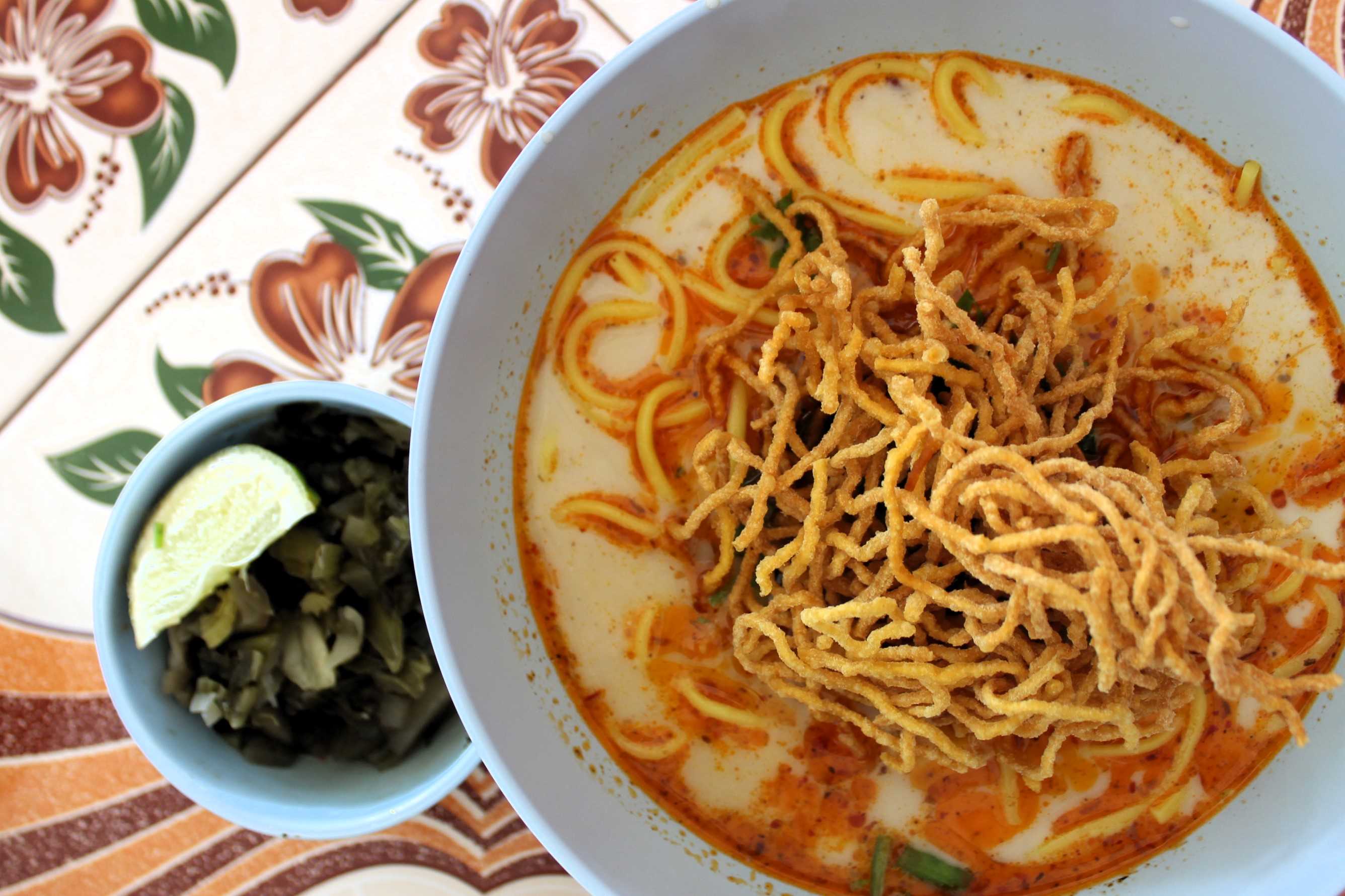 At least I finally manage to eat some Khao Soi, which is said to be the most traditional Northern Thailand dish. I tried very hard to find some when I was leaving Chiang Mai, but apart from the tourist restaurant near the Old Town, none of the food stalls outside the city were serving this “traditional” dish. It consists of a curry dish, with chicken and bot soft and crispy noodles. I asked to have mine without chicken. I love it! A bit spicy but delicious! I feel like having a coffee after, so I ask for some hot water to the ladies from the shop. They are very kind to me.