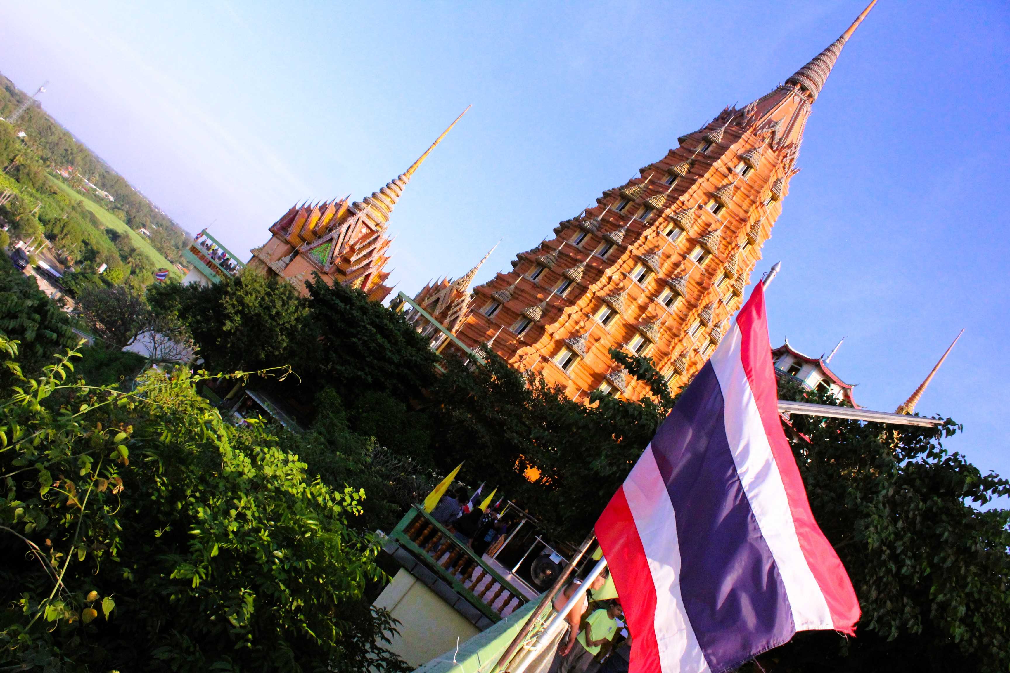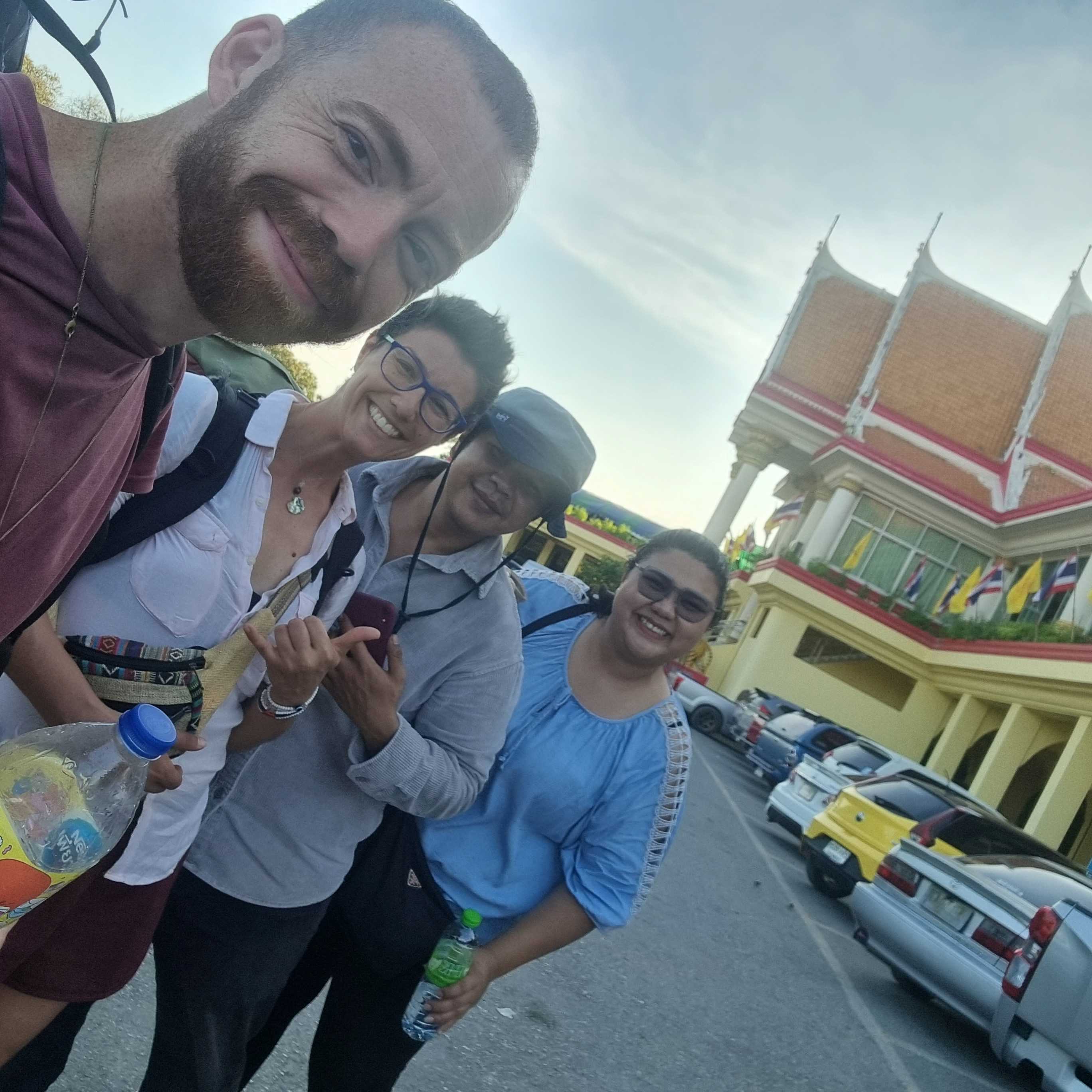 Back to the main road, no shade and the sun is devastating. Our hitchhiking spot is not great either, but there is nothing better ahead, as I checked on Maps before. The train passes. It brings us luck because right after a car stops. I run to talk with them and I figure they are going to the same monastery as us: Wat Tham Suea (Tiger Cave Temple).