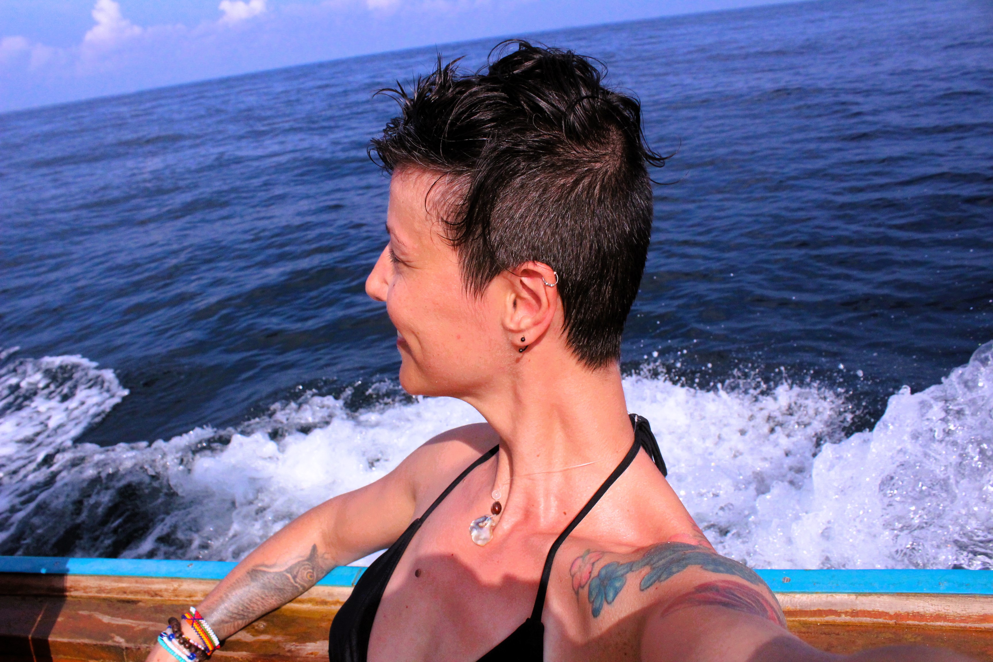 I am still learning how to swim, so it is not very easy for me to manage even with the life jacket. After only a few weeks trying in the 1.5 metres deep swimming pool of my apartment, this is the first time I am where I cannot reach the bottom. At first, I manage, and I see some gorgeous fishes really up to my nose. But the life-jacket being too big for me, makes me loose balance, and I keep rotating, so soon enough I panic (laugh) and all is lost. I finally manage to come back to the boat, and that is the end of my snorkelling adventure.