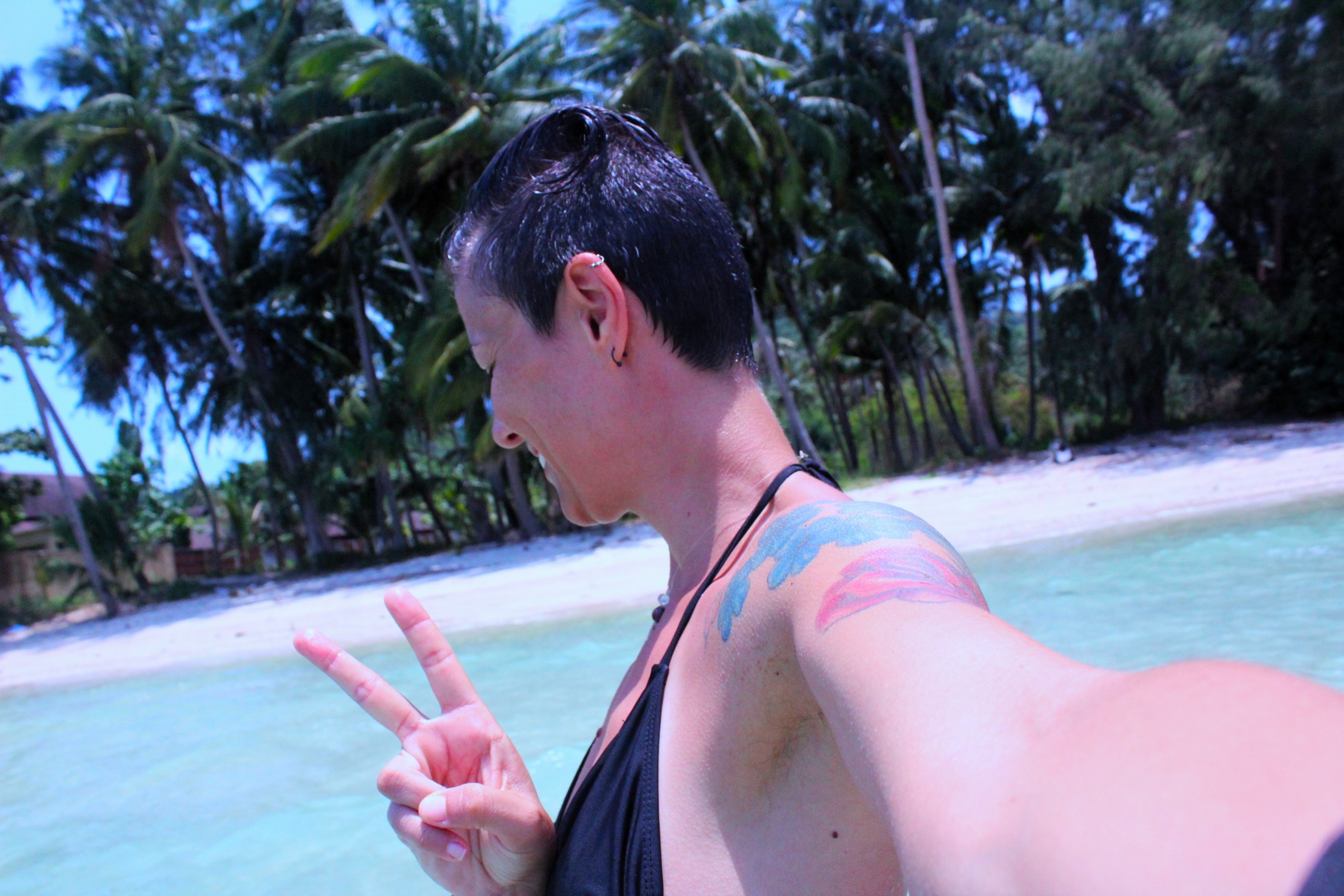 Laem Yai is a super cute beach! I love it! The water is super clear and of a beautiful blue and turquoise. The sea is very calm here, and very shallow too. I could easily walk up to 50 metres with the water at my knee. As you can see in one of the photos.