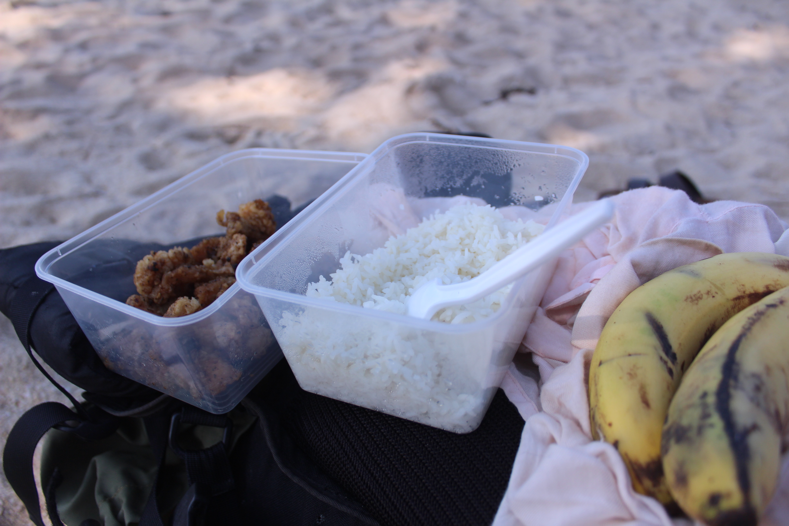 In the middle afternoon, reluctantly, I leave Laem Yai to go to the next beach on my list. When I stop at the resort Tui Blue, the manager is not there, but he has instructed his team to give me the food. I get two big takeaway boxes, one filled with rice, and the other with fried chicken fillets, done in a very special (fancy) way, and not greasy at all. They also give me 2 bananas. I fill my water bottle. Wow! That’s enough food for lunch and dinner! Yay!
