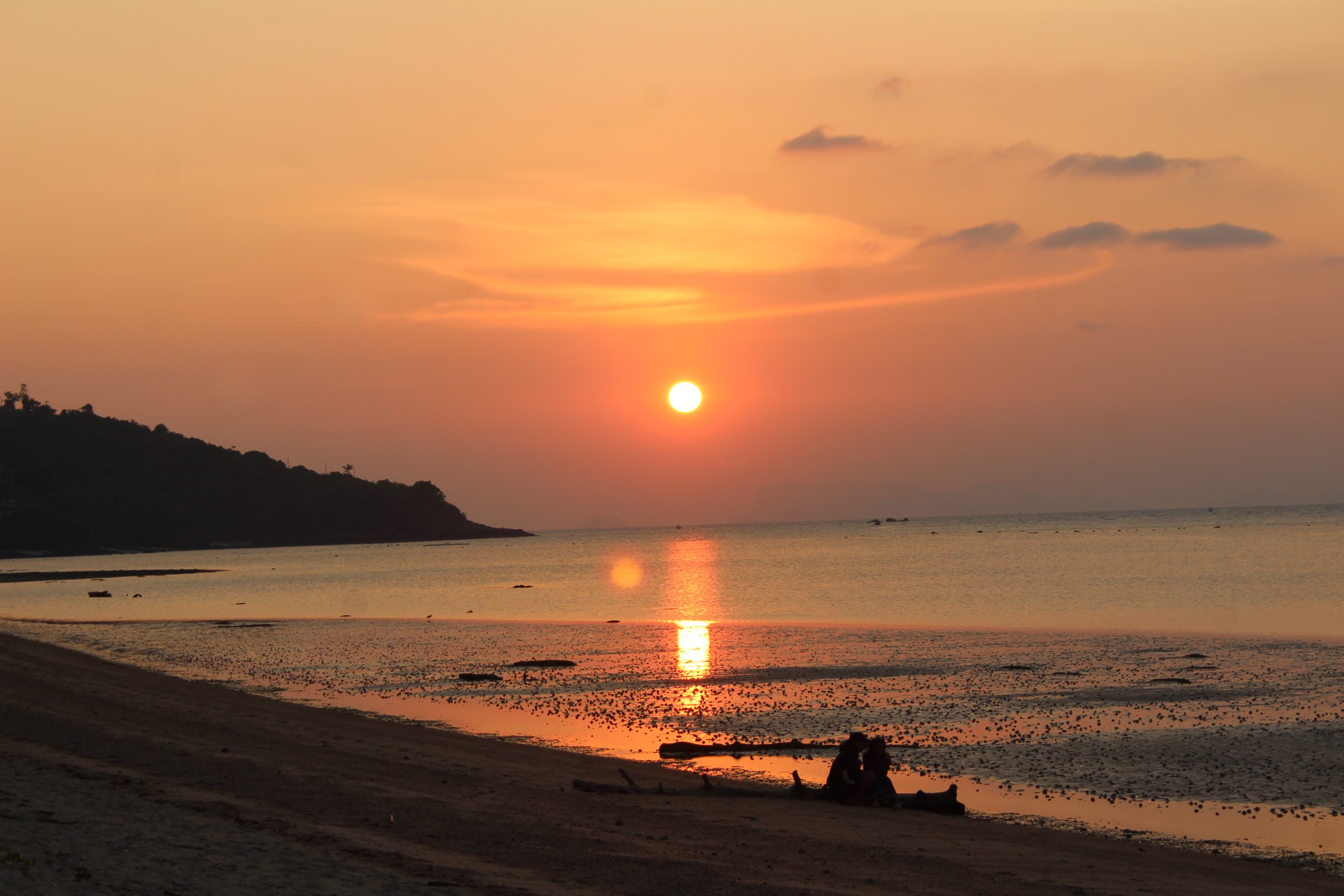 I don’t like it. Laugh. I mean, it is nice, and actually right now the sunset is absolutely amazing, but it is completely desert; there are no places where I can get food or water nearby; and the level of the tide worries me a little too; we go back to Laem Yai, and Ad carry on to the gym.