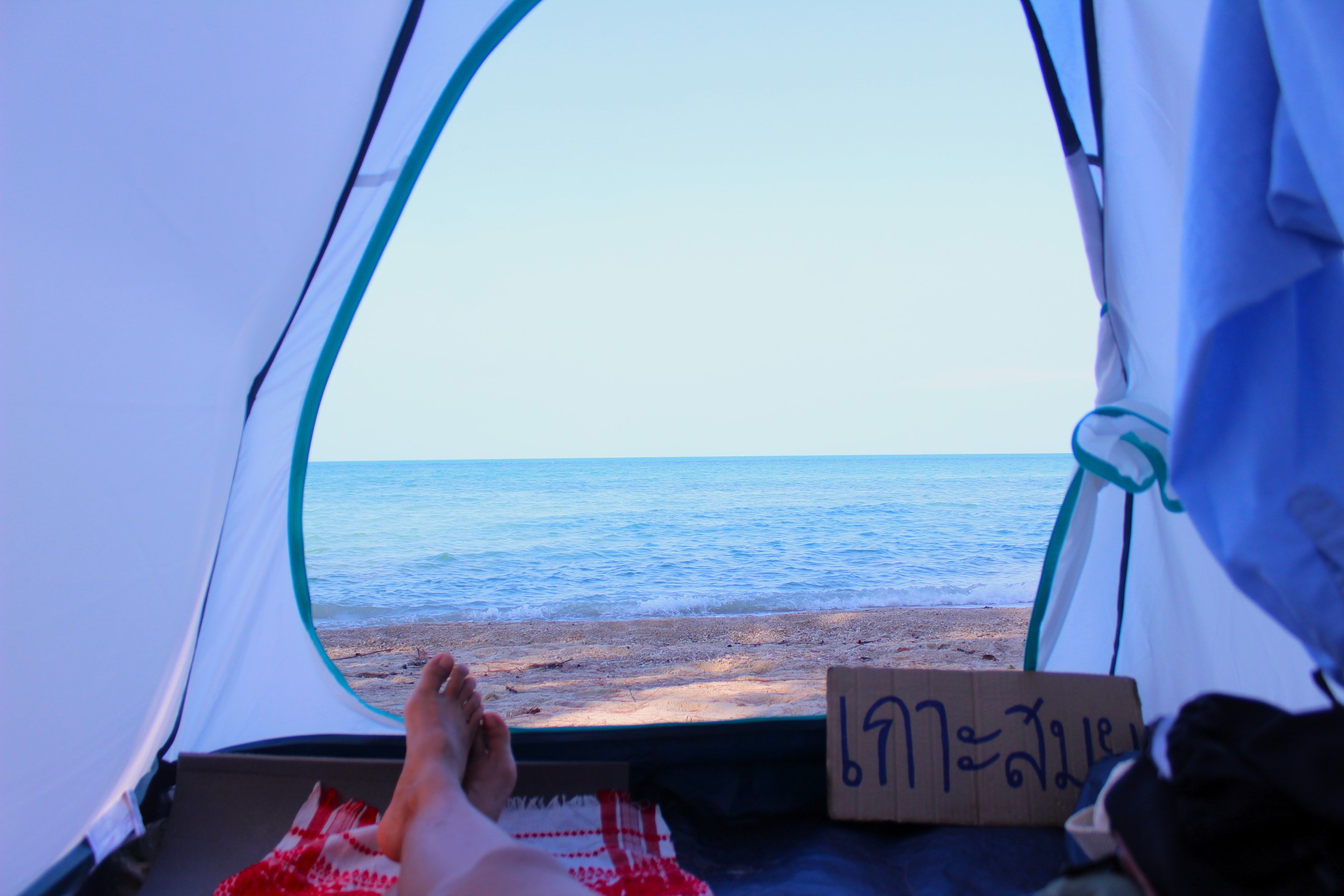 Completely by the opposite of that beach, I love Laem Yai! We enter the beach through some coconut trees, which is already beautiful! Then, I see some open sheds, more like gazebos, but public ones, and I even consider to pitch my tent under one of them, but then I imagine that there could be less breeze, and I also see come bottles nearby, so perhaps people like to come here to drink at night. Right now, the sunset is breath taking, making the sky its own colour palette, with shades of orange, blue and black. And I am taking photos! There are some traditional boats on shore, which contribute even more to the shots.