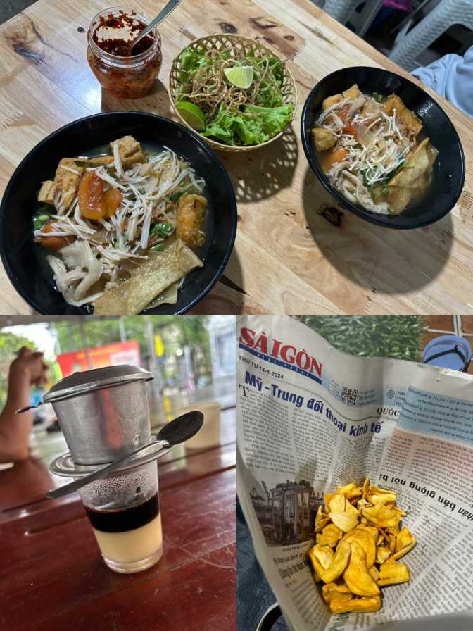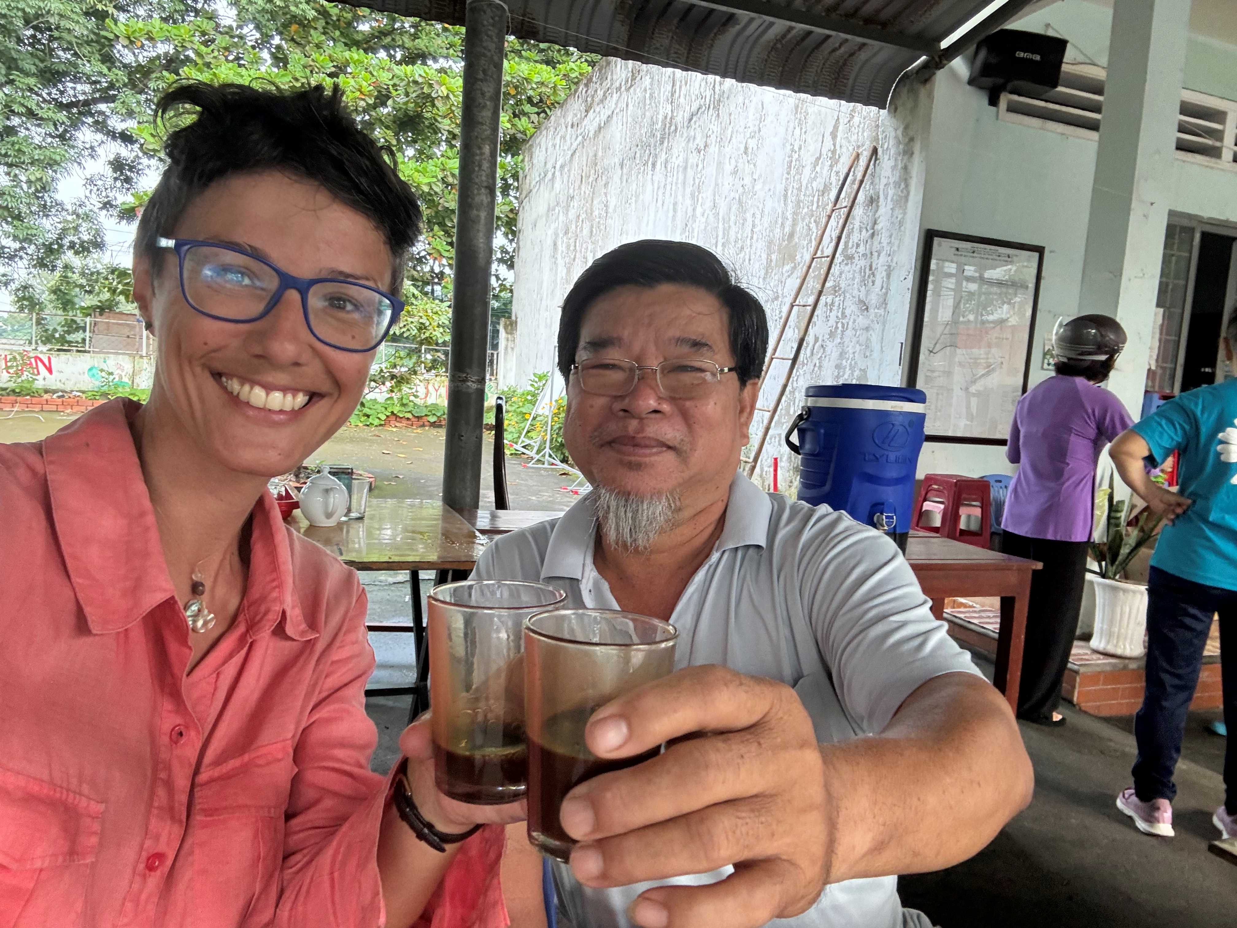 Next morning, I am ready around 6 a.m. when a senior man comes over. He offers me coffee and I gladly accept. It is my first cafe sue, the famous coffee with condensed milk of Vietnam. It is super cute, with a drip tiny system on top of a small glass, filled until one third with condensed milk. As we are having it hot, you just mixed after the drips are done and voila! I loved, of course, but it’s thick and sweet, as they don’t add a lot of hot water. Even though it is a very traditional coffee in Vietnam, I believe that the iced version is more common.