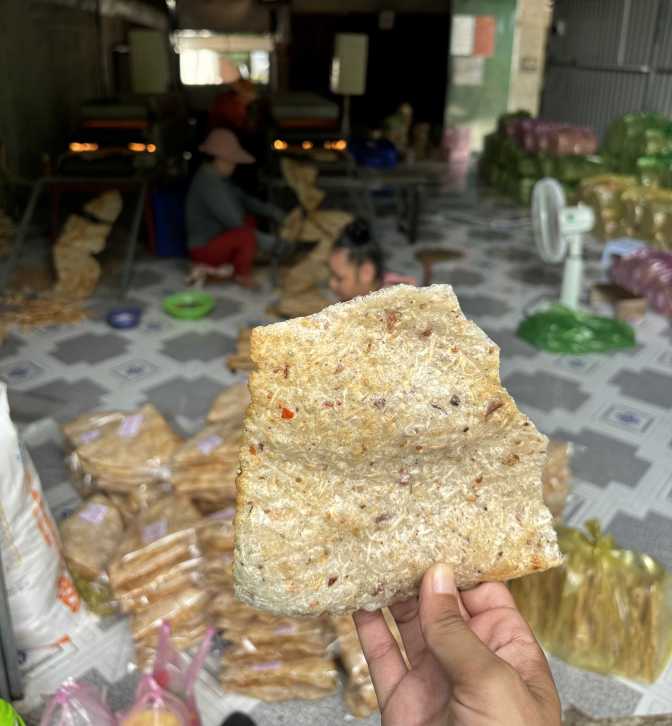 I have my other bread and delicious cake siting in a coffee shop by the river. When I start walking again, I pass by some ladies making my most favourite snack, the crispy rice paper called Khao Taen. It’s so amazing! I ask them if I can have one. They try to give me one package, but as they are filling the packages with five or so, I show them that I only want one. It is the most delicious one I have ever had, and will have, in Vietnam. There are onions and chilly on it, together with the black sesame seeds. Simply amazing!