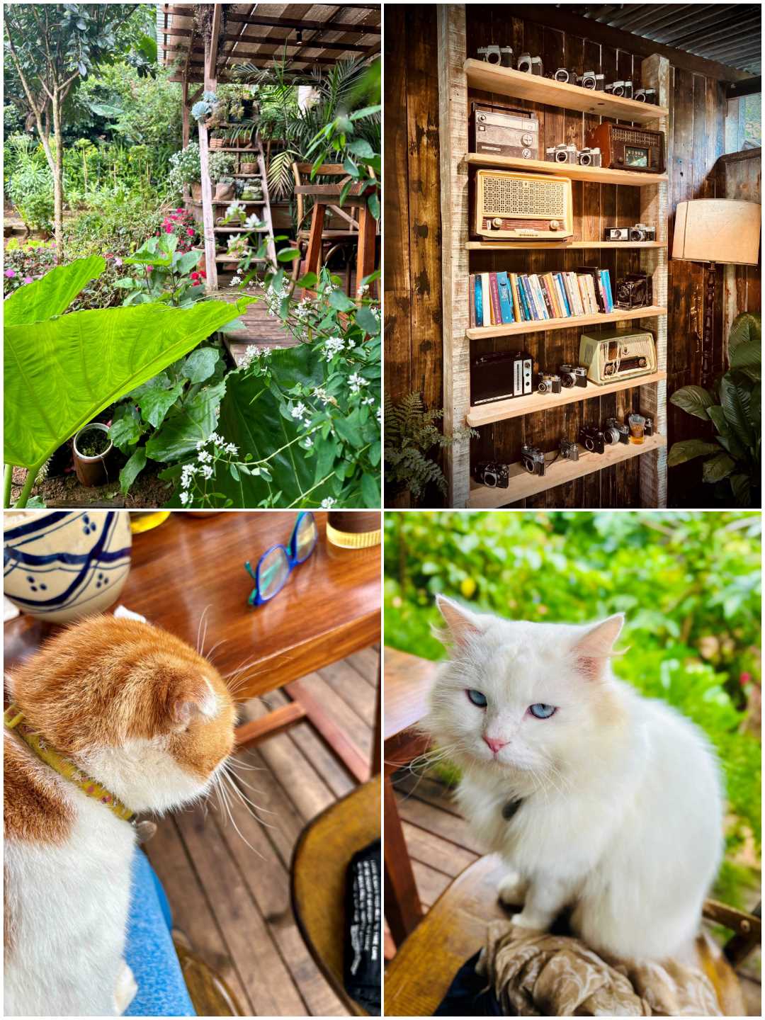 The cafe is absolutely adorable! There are plants and flowers everywhere, all over the place, and all seems super clean and tidy, not as it was made and then let to rotten. I loved the attention to the details too, with many small plant vases, all different sources, shapes and colours. Then you have the big plants, trees and flowers, roses too, planted all over the area. And the vegetables which they use to prepare the food, all very fresh and organic. Absolutely amazing! So even though the weather is not that great for photos, the rain keeps coming and going, we have a great photo shoot anyway.