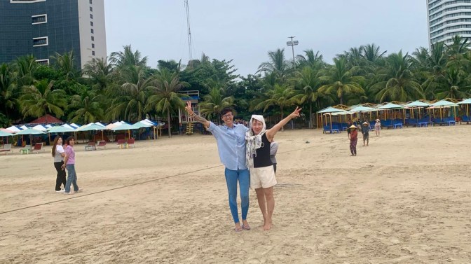 We then walk to the beach, which is so cool! Khánh and I have some ice coffee on the way, yay! The beach is huge and surrounded by huge and fancy hotels. From one of them, a big group of Indians is leaving, and Thẩm asks one gorgeous Indian senior lady to take a photo with her. I think it’s kind of ironic, as I explain later to Linh, because in India, most foreigners kind of suffer with the harassment of being asked for photos, and now here, in Vietnam, the opposite just happened. But the Indian lady was happy with the moment, and surprised when I greet and said thank you to her in Hindi.