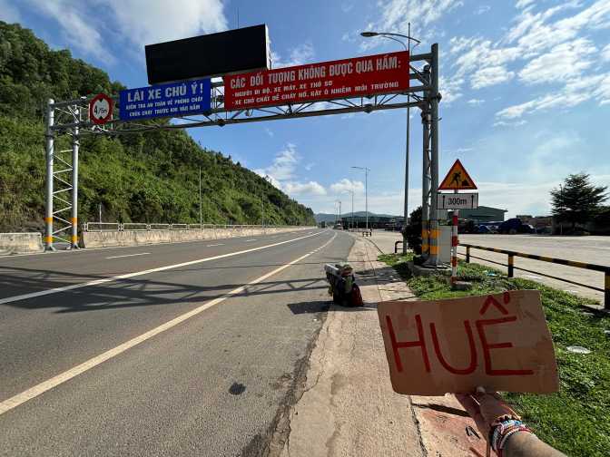 I start walking while holding my sign which reads Hoi An at the same time because there are too many lanes at this intersection, and the one further right, on which I can walk, is for motorbikes only, so the cars don’t have a clear view of me. Those are a few tips for you hitchhikers.