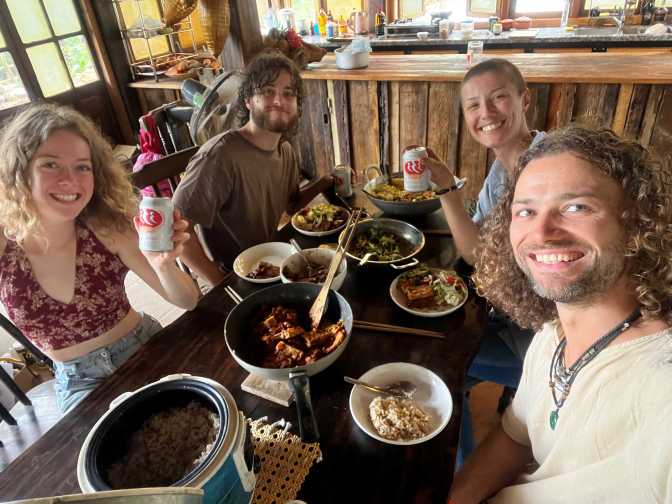 The food is almost always vast and delicious! At the very beginning, we are a bit confused about shopping for ourselves, as we have to borrow the motorbikes from our neighbours to go to the main road and get the groceries, but once we get into it, everything is fine. We always come up with some great recipes, with enough diversity, and some delicious dishes arise, like Niki deep fried tofu in tomato sauce. We also have some lovely spices mix, which is “called” jungle magic, and that’s all the extension of our knowledge about it; some peanuts and seeds savory mix, which goes wonderfully with basically everything; we get one package of a special coffee which contains some notes of cocoa, and it’s absolutely delicious.