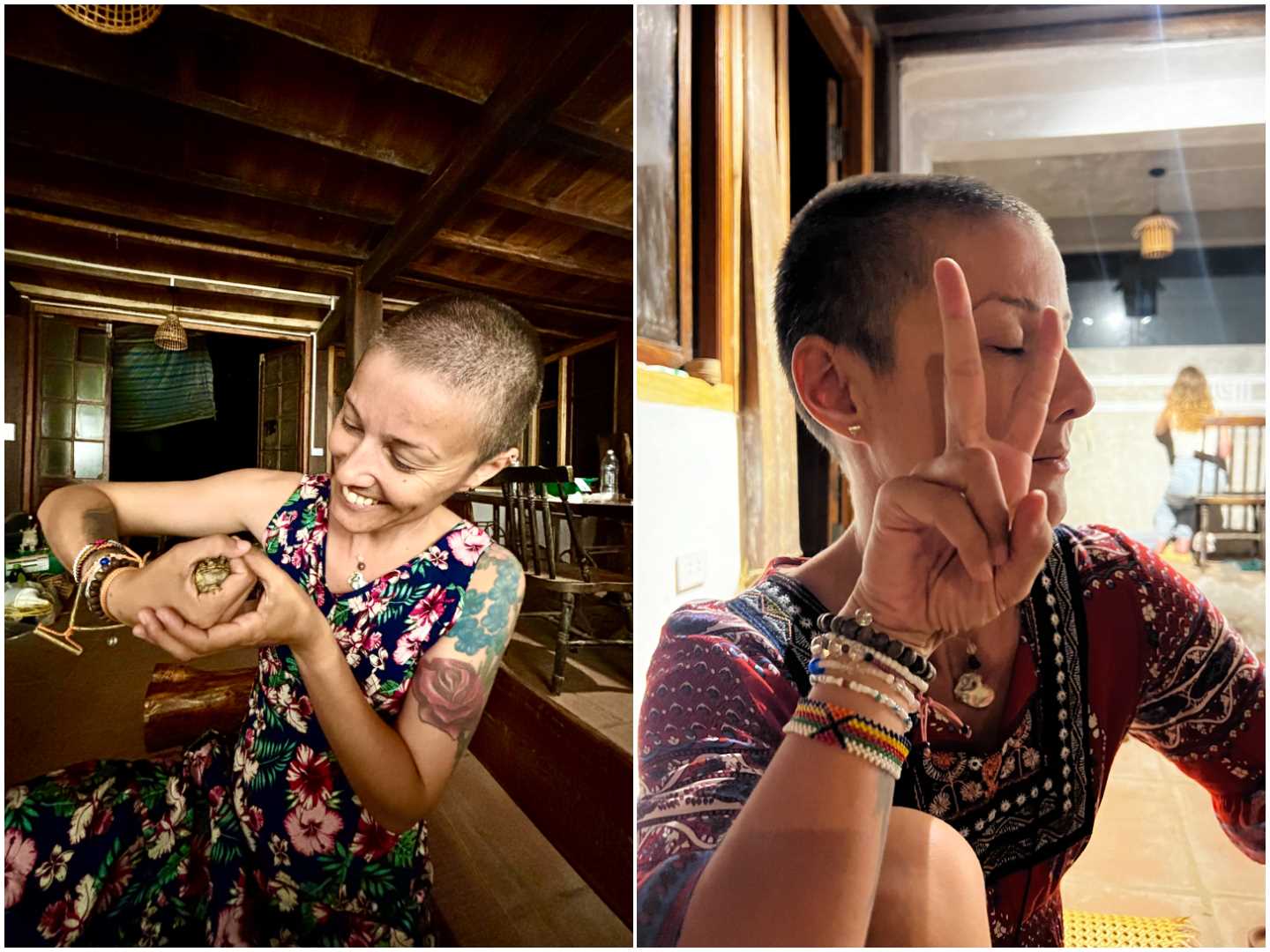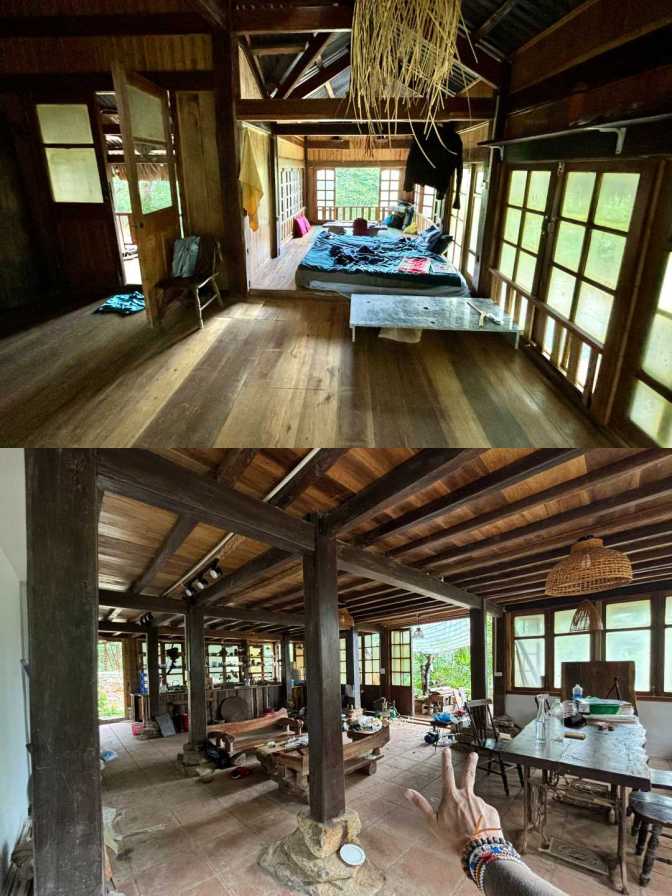 Nicky, Mika, Kuba and I are doing other smaller tasks. We sand the concrete walls, paint them, sort out the tools, tide up many areas, move big blocks of wood, doors and windows, to another area, always trying to make the main house look more ready. Niki is a wonderful artist and she creates some gorgeous wooden plates, drawing magnificent patterns on it. Mika is helping with hanging some lamps, and sanding some wooden pieces. We also have a local guy who comes to do some deeper work with the wood, but he doesn’t come very often. Kuba improves the main path to the river significantly, making look like there wasn’t any path before; and he also help the locals with the paths, or creating an outside stone table, which we celebrate with some beers and snacks after. I will also mention that he built a cave but I won’t give you any more details, so the rest is for your imagination. I was… well, I started cleaning the glasses of the windows, trying to let more light getting through them, but soon I realized it was a waste of time, as it would take way to long to clean them all. So I started a new project together with Niki, which was to decorate some of the downstairs walls; she would do the drawings and I would create wooden shelves and plant vases to it.
