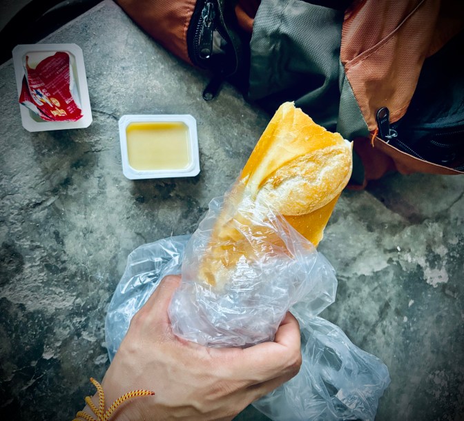 In the morning, the father of the family gives me a bag with two steaming hot baguettes, which smell just like heaven. There’s also a small plastic container, which I can’t tell what it is at first, but I am just hoping it’s not ketchup.
