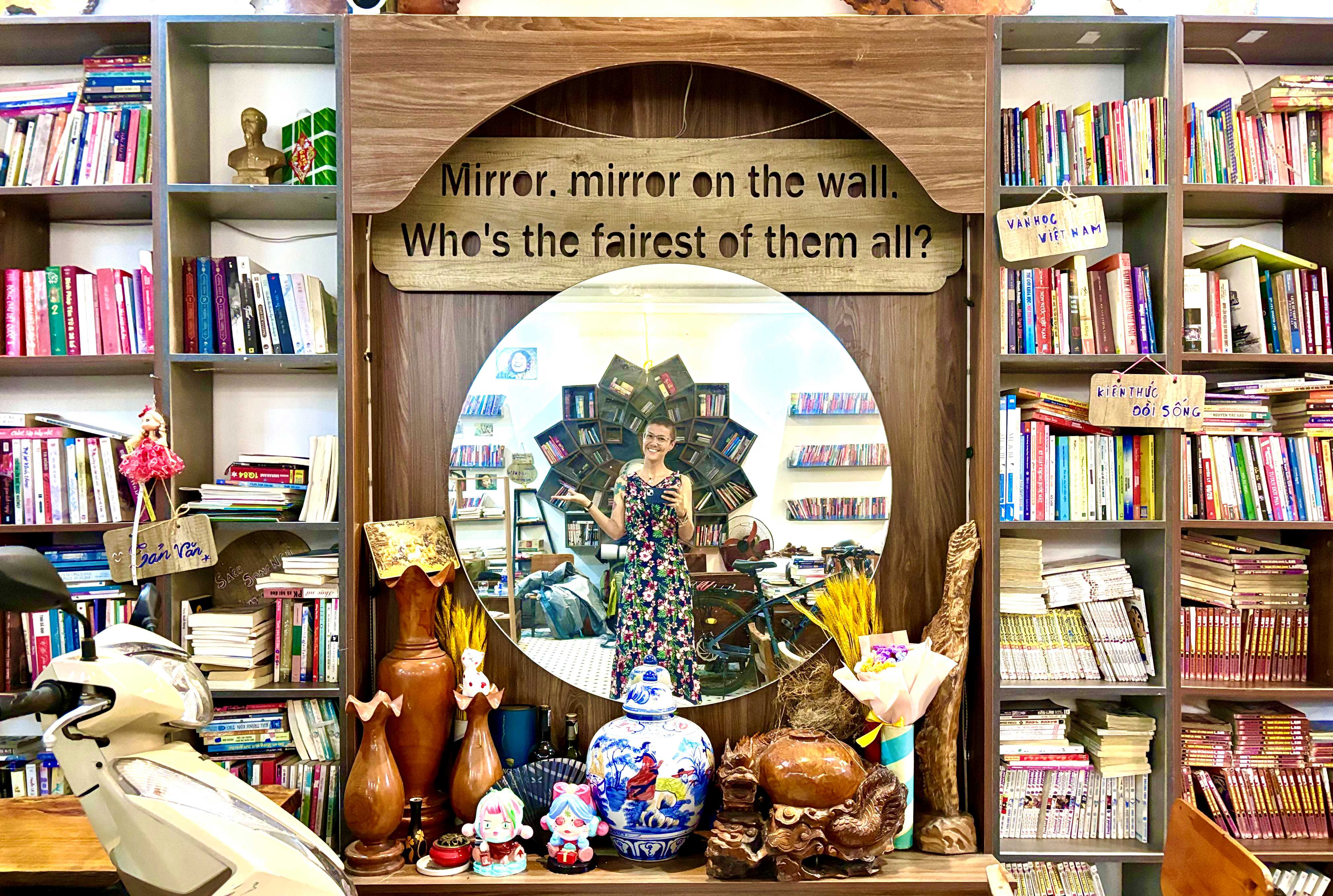 Time + Books Coffee Shop is adorable! It’s full of books and some wonderful wooden furniture. And a gorgeous wooden statue of the Four Spirits. There’s a beautiful mirror with the saying “Mirror, mirror on the wall / Who’s the fairest of them all?”. Love it! And some beautiful photographs of Vietnamese people and culture. It’s a lovely place to chill and enjoy some quiet and peaceful time.