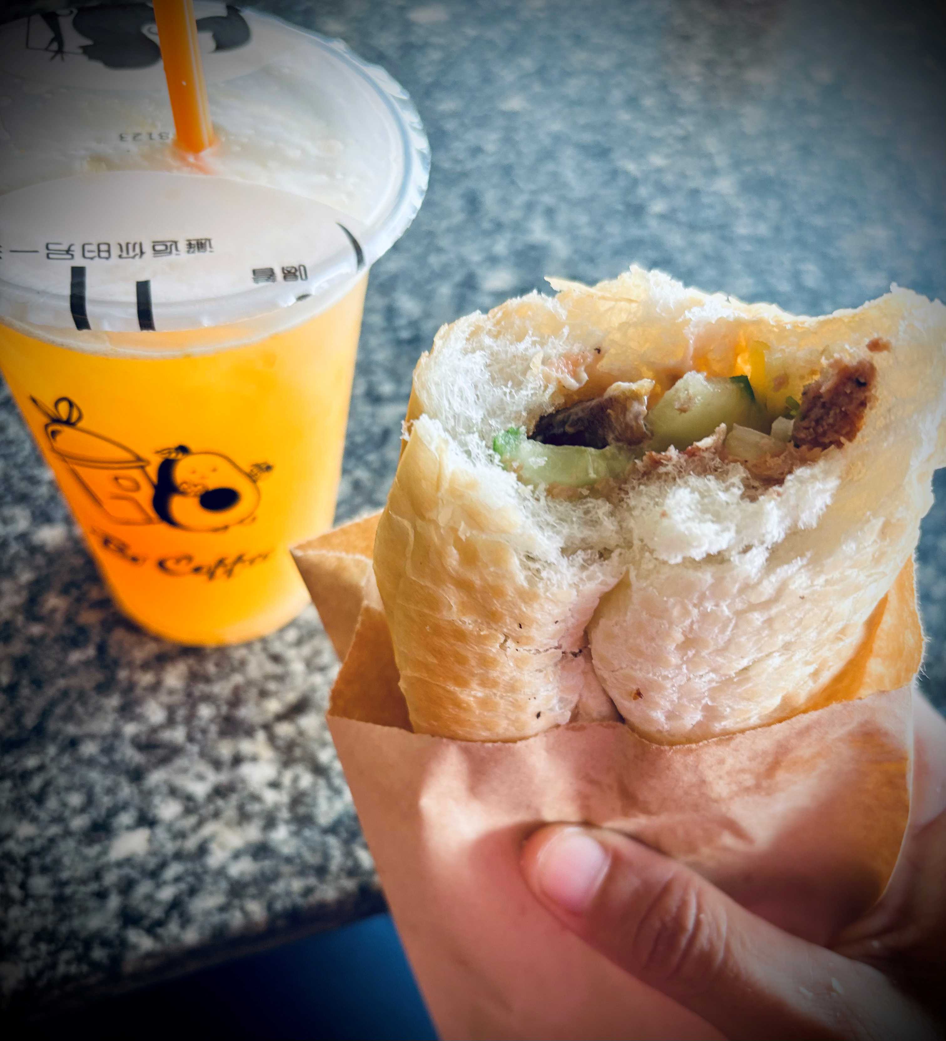 It’s not. It is condensed milk! Yep! Believe it or not, it’s a small portion of condensed milk, like these take-away packages of ketchup which you get on McDonald’s, for example. I don’t want the bread to get cold, so I sit somewhere and start eating. Oh, It’s so yummy! While I am eating, a mango fell from the tree which I am under. It smashes on the floor and I am happy it didn’t fall on my head. And then I ate it.