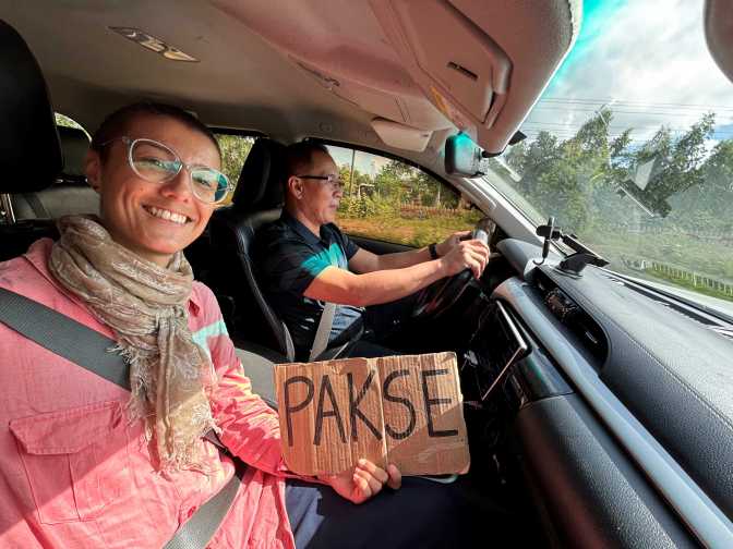 While I am still walking outside Xeno, a car stops. Asu is a forestry officer, who is going to Pakse to visit his father in a hospital. He can speak a bit of English and he tells me he is divorced and has three sons, one studying in Japan. He is from a little village nearby Thailand, called Song Mae Bao Tao. We stop in some food shops by the road and he buys some of my delicious crispy rice cakes, in Thailand, where they are originally from, they are called Khao Taen. The one Asu buys is green. And it’s delicious!