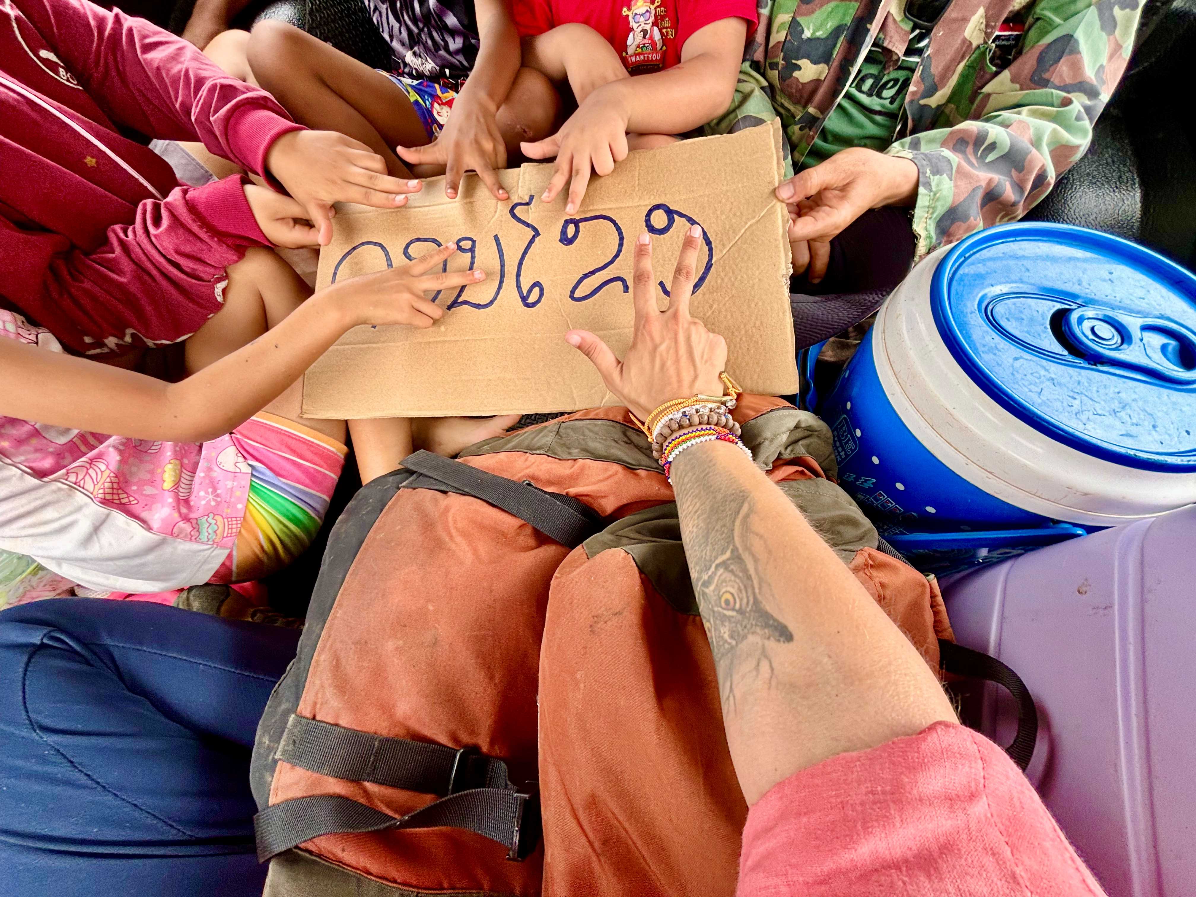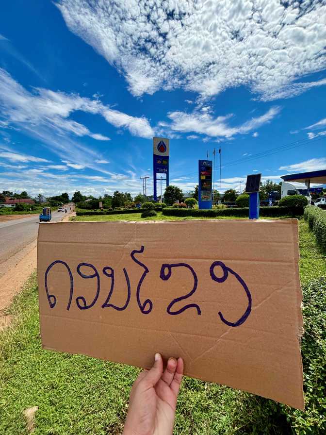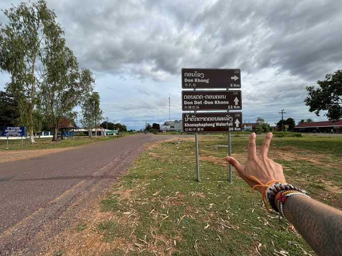 At the new spot, I wait for a long time. Why is nobody stopping? On my sign, I wrote Don Khong, a bigger island than Don Det, and I thought people would know it better. I guess I was wrong, as I would get to know only later how famous Don Det Island is.