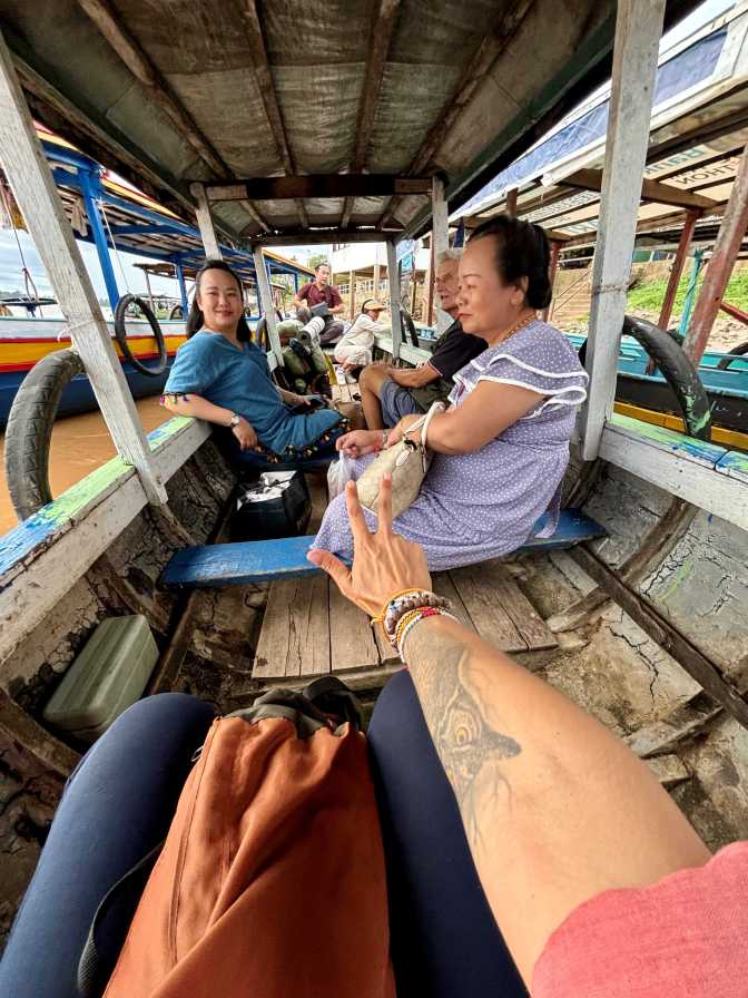 I get there just in time to catch the ferry. Well, actually they are long tail boats. It costs 20.000 Kip, the equivalent to 1 USD. Luckily, I have one USD change, and they accept it.