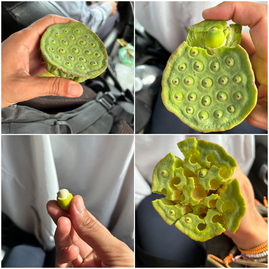 On the way, they buy a very curious “fruit”, well, at least at first I thought it was a fruit. I would never guess it is edible, as it looks very weird. But I try, of course, as they kindly offer me. It tastes / looks like broad bean’s seeds. Laugh. What is it? Lotus seed. Yep! Apparently, the fun is more about the process of eating it (you have to break down the pieces, open the shell, and then eat the seeds inside), than actually the taste.