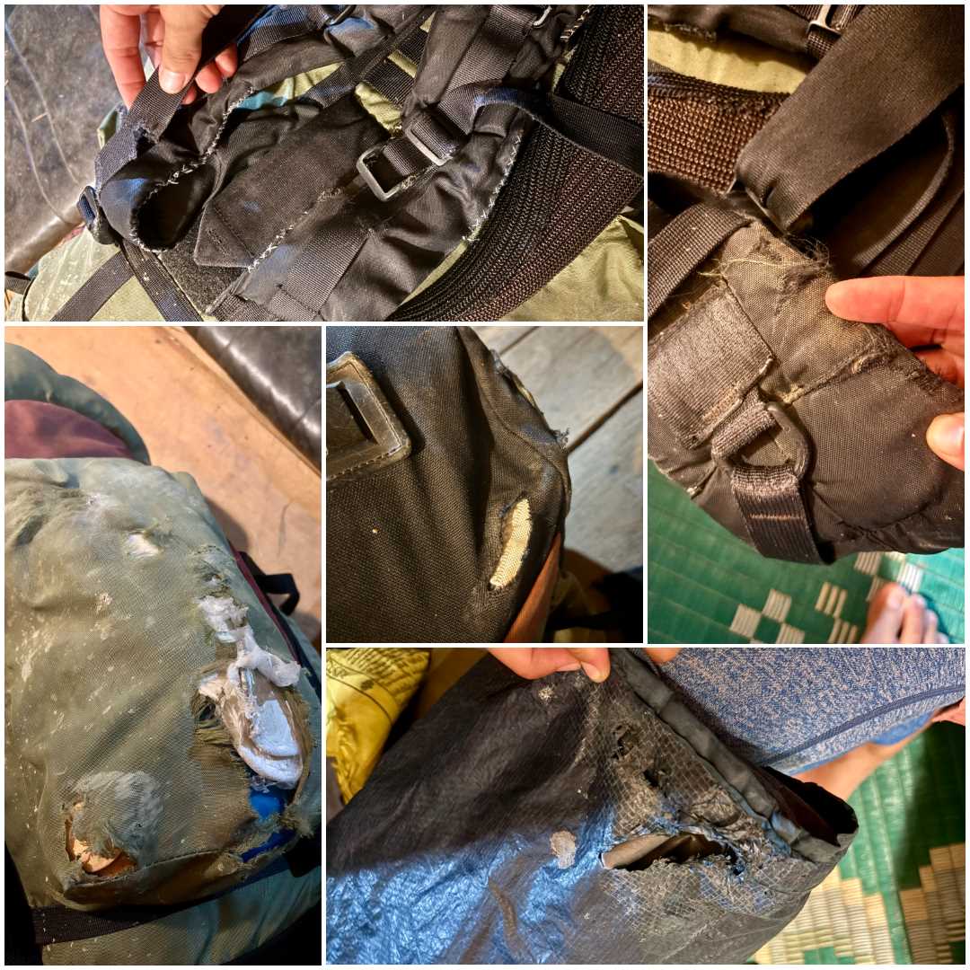 The men drop me off outside Pakse, at the same place I was dropped off before, when I was going to Don Det Island. Here, I have the time to take a look at my poor Hulk. I swear, it hurts on me to see her wounds. I have never myself had an accident, and now she has. I think that if she wasn’t The Hulk, it would be much worse. Still, there are lots of damage. One of her side pockets got pretty scratched, and with it, many of my things inside. The tent has scratches too, big holes here and there. My camping mattress lost parts of both sides. Bottom and the back of The Hulk also got scratched. The top stripe, which offers support, lifting up the backpack, and so on spreading the weight in a better way, got broken.