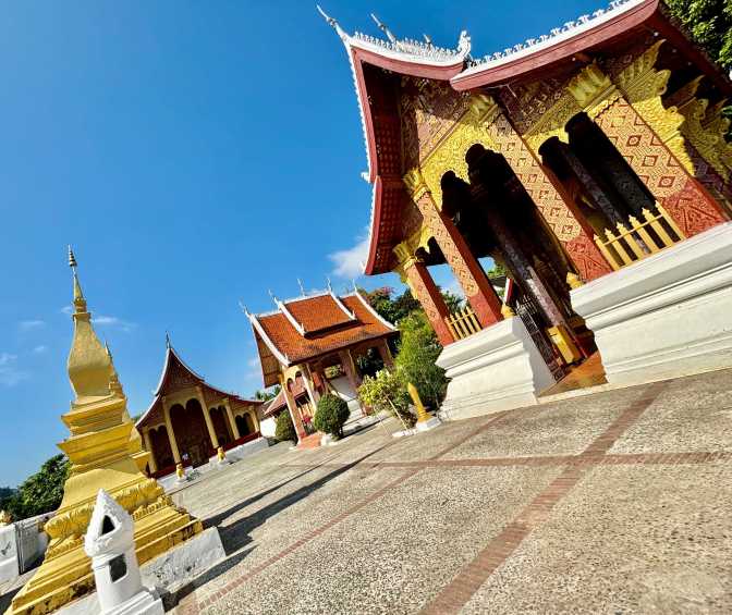 Luang Prabang is cute. I guess there is quite a few places to visit, and mostly if you are paying the entrance fees, than you will have a lot to see. There are just enough nice temples which are for free, and just as gorgeous as the paid ones. They probably just choose randomly which ones they will start charging. I feel sorry that to go up the mountain in the centre of the town you also must pay. And that’s, most likely, just because there’s also a temple up there. So yeah, I mean, all you can do is just walk around and admire the architecture, I think…? There are a lot of shops and tourist traps as well, of course. Many coffee shops and restaurant which are Westernized, and are full of tourists. Why do people come all the way across the planet to eat, to drink and or stay in a place which is the same style as your own country?