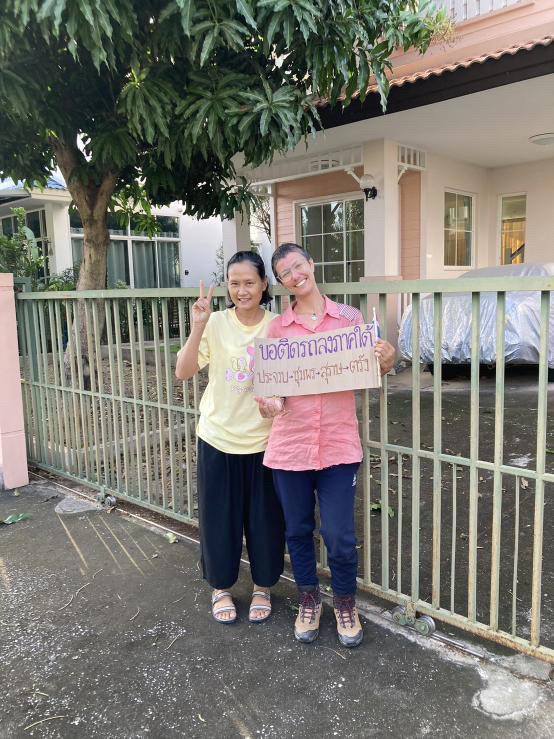 As Yuni is an artist, actually a designer, she made something for me. It’s the fanciest hitchhiking sign I have ever had. And the most clarifying one. It has even the Thai flag on it! It’s adorable and I love it! We took photos with it right in front of Yuni’s house, before we left. Now I will use her sign to try and catch a lift.