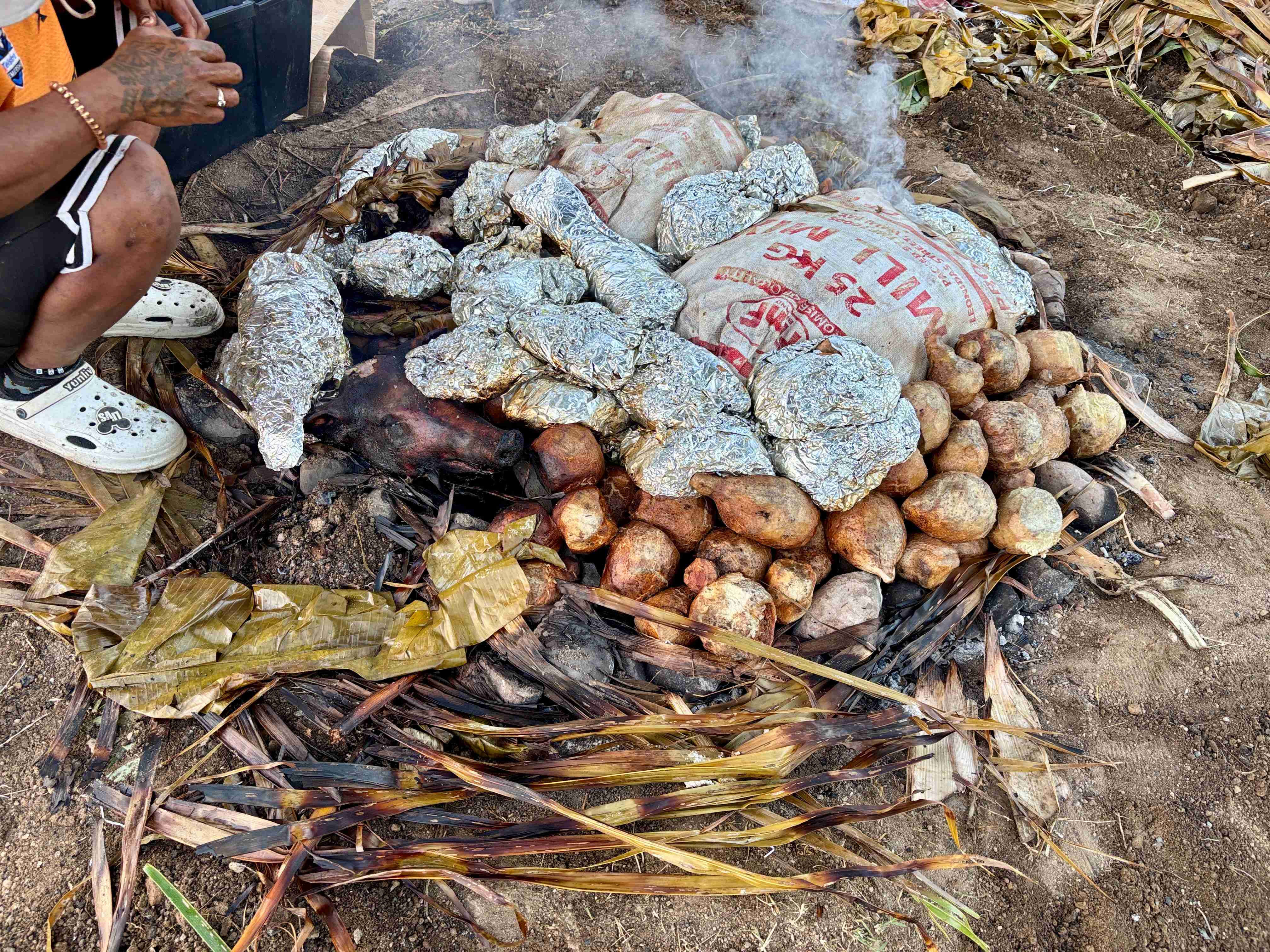 In a bit over a week, there will be the 21st birthday of Ako’s daughter, Rosie. Here in Fiji, this birthday is very important and celebrated in a special way. The reason being the fact that the father gives a symbolic wooden key to the child, representing the freedom for leaving the house and becoming an adult, starting an adult life. So for this occasion, we will be making the traditional way of cooking called Lovo. It consists of digging a big whole on the ground, filling with wood, then big stones. On the top of the stones, we have lots of food wrapped in tin foil, fish, chickens, potatoes, cassava, tolo (a local type of root, very popular), and the star is the whole pig which is also cooked in this way. Then you bury all of this pile with soil, lit the fire (or vice-versa, I was not there when they did it), and let it cook for many hours.
