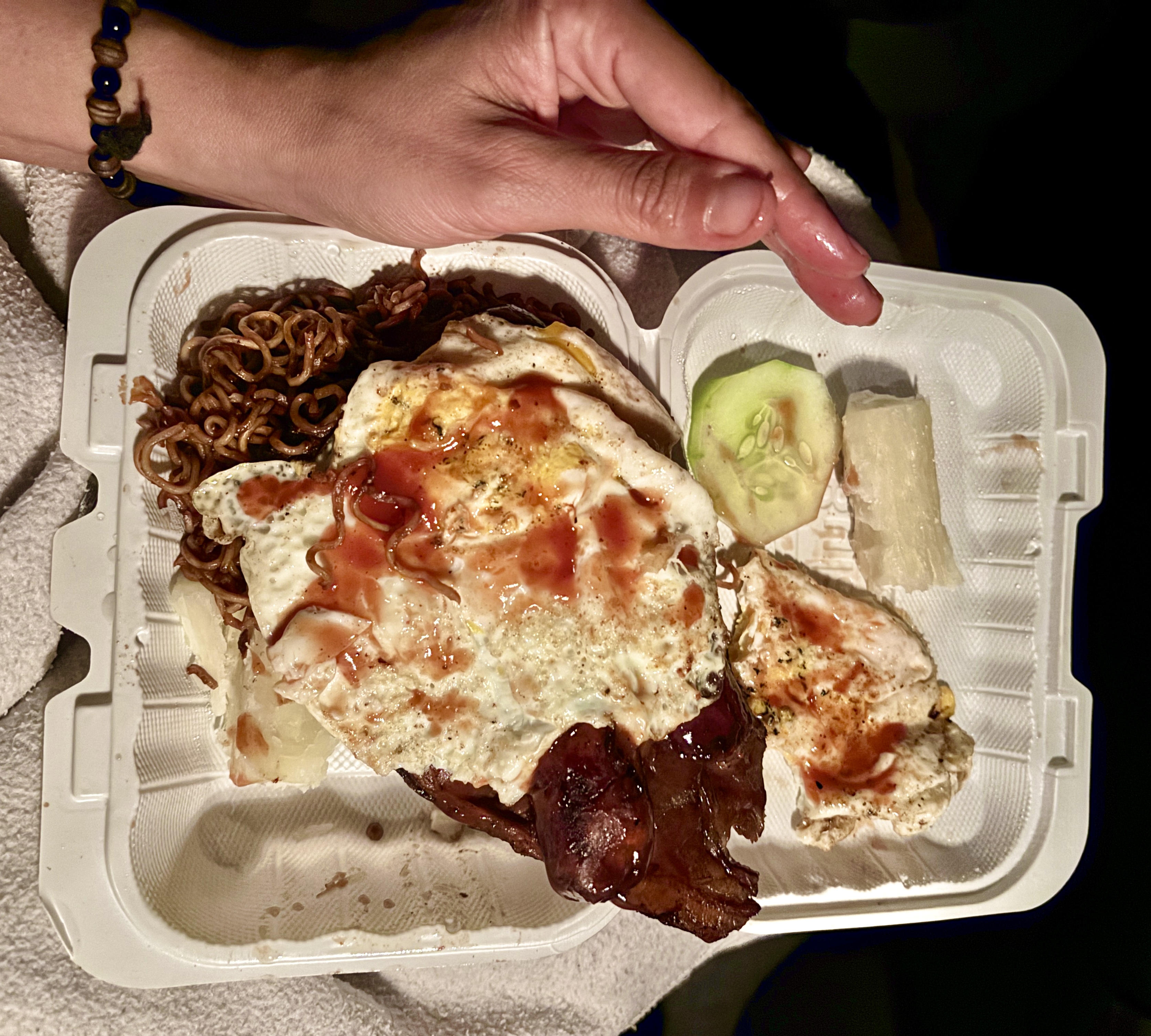 The food is delicious. I try a little bit of everything. We have lots of salad too, potato salad and also pineapple. The cake is so good that I could eat all by myself. There is so much food, and I do think that’s the idea, that we give all the guests a take away box with loads of food, and we would be eating the leftovers for the next two days. If only the cake had also lasted two days… Laugh.